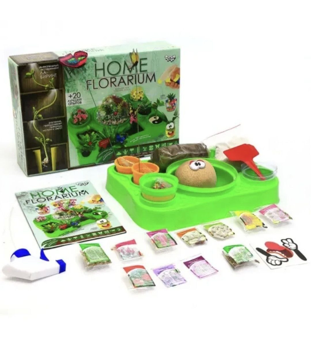 – контейнер; – купол зелений і прозорий; – декоративні метелики і жуки; – гідрогелеві кульки; – пульверизатор; – трав’яний монстрик; – стаканчик полімерний; – торф’яні брикети; – покажчики; – пісок кварцовий; – дерев’яна паличка; – градусник; – “Чарівні боби”; – комплект насіння (може відрізнятися в залежності від сезону); – картонний лабіринт; – інструкція.