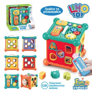 Розвиваюча іграшка-сортер Куб Limo toy FT 0003 (українська мова) – багатофункціональна, якісна іграшка з пультом дистанційного керування, з широким спектром інтерактивних функцій сприяє розвитку у дитини правильної мови, звукового та слухового сприйняття, дрібної моторики, тактильних навичок, уяви , а також усидливості. Ця іграшка може відтворювати веселі пісеньки, звуки тварин, музичні ноти, захопити малюка забавною анімацією, брязкальцями, безпечним дзеркальцем та іншими елементами.