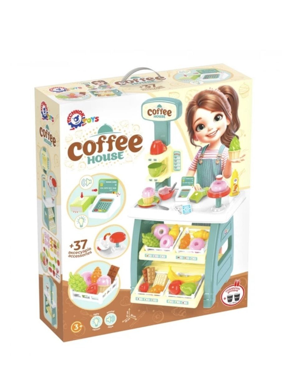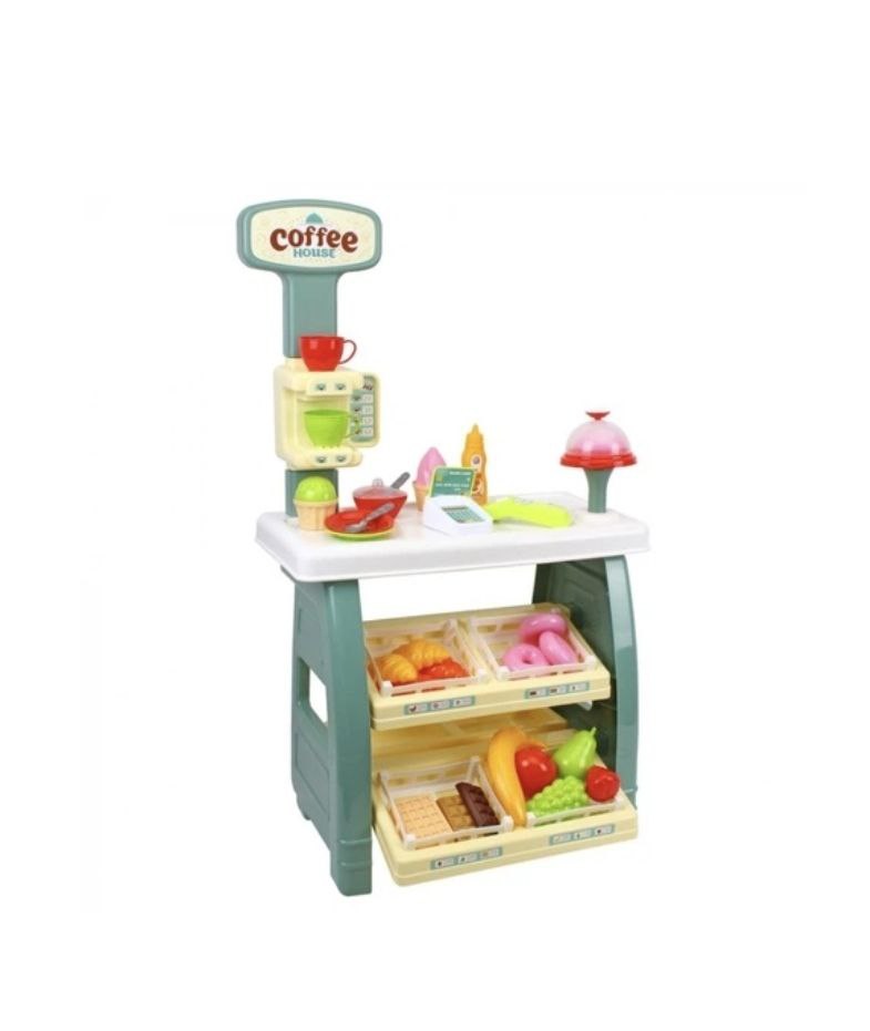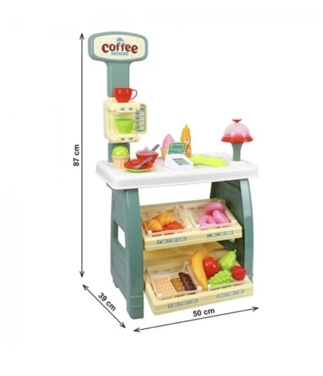 До того ж, у наборі є все необхідне для приготування кави та подачі десертів: стильний посуд, підставки для тортів і солодощів. Велика стільниця з кавоваркою та вивіска з меню додають грі реалізму.