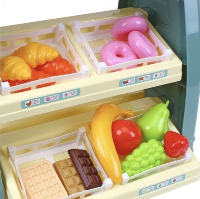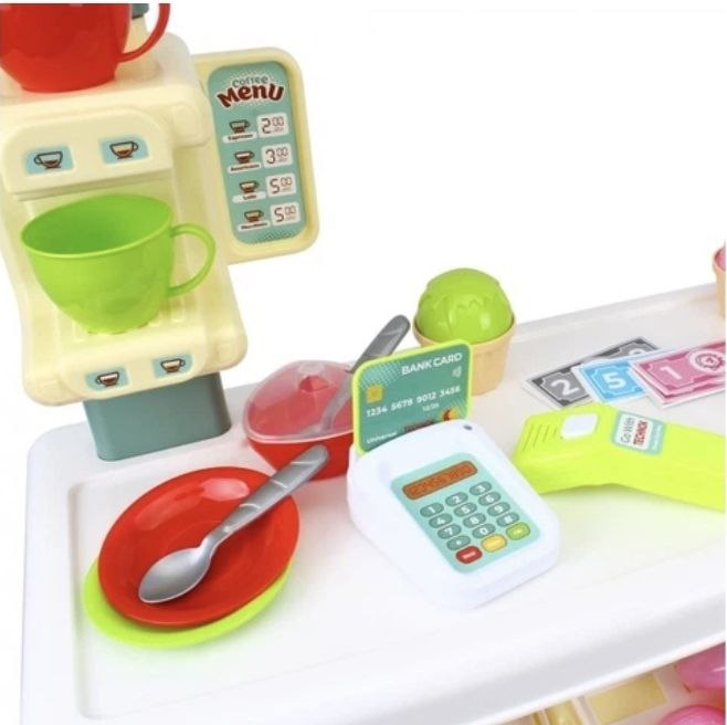 Цікавинкою набору є банківський термінал для оплати банківською картою ( яка є в комплекті) та сканер коду, які імітують процес оплати: звучить звуковий сигнал, спалахує лампочка. А при бажанні – доступна оплата паперовими “грошима”, що теж є в комплекті. Це допоможе дитині вчитися взаємодії з клієнтами, рахувати та віддавати решту, та робить гру максимально захопливою та пізнавальною.