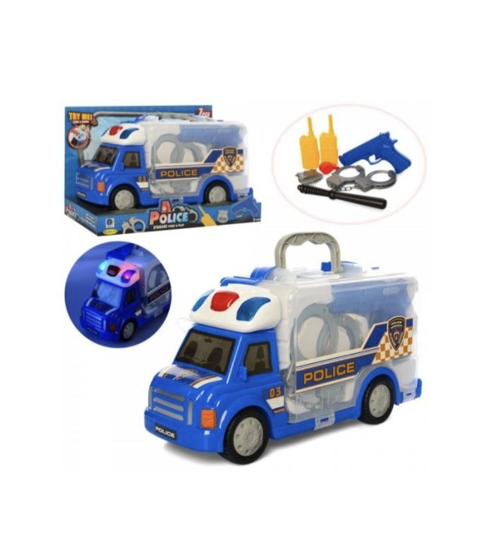 Ігровий набір — це яскрава машинка у формі поліцейської з аксесуарами всередині. Вона оснащена світловими та звуковими ефектами, працює від батарейок. У комплекті — машинка, наручники, пістолет, рація. Всі елементи виготовлені з безпечного та міцного пластику. Іграшка сприяє розвитку уяви, дрібної моторики та інтересу до поліцейської тематики.