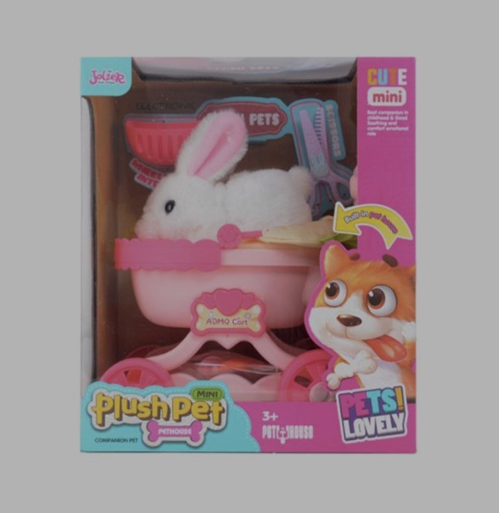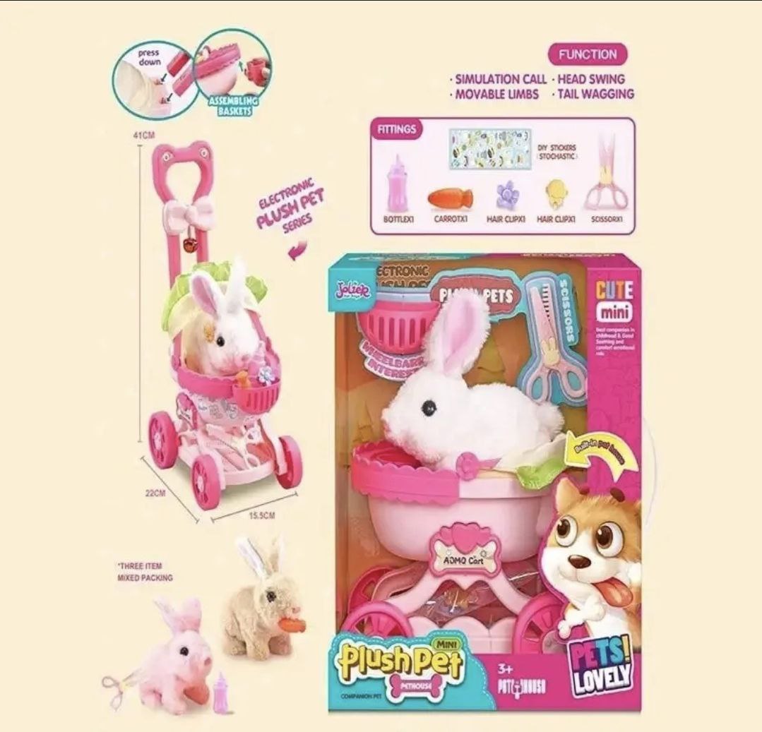 Кумедний кролик мовчки сидить у колясці. Але ж це ненадовго! Варто натиснути на головку тварини – як почне видавати характерні звуки. А якщо активізувати інтерактивну іграшку – кролик ще й пересуватиметься. Іграшка має приємне на дотик текстильне покриття, що імітує справжнє хутро. Яскрава коляска добре рухається по рівній поверхні і має спеціальні отвори для лапок домашнього улюбленця. Знімну ручку коляски прикрашає дзвіночок. Аксесуари представлені у вигляді муляжів товарів для догляду за тваринами.
