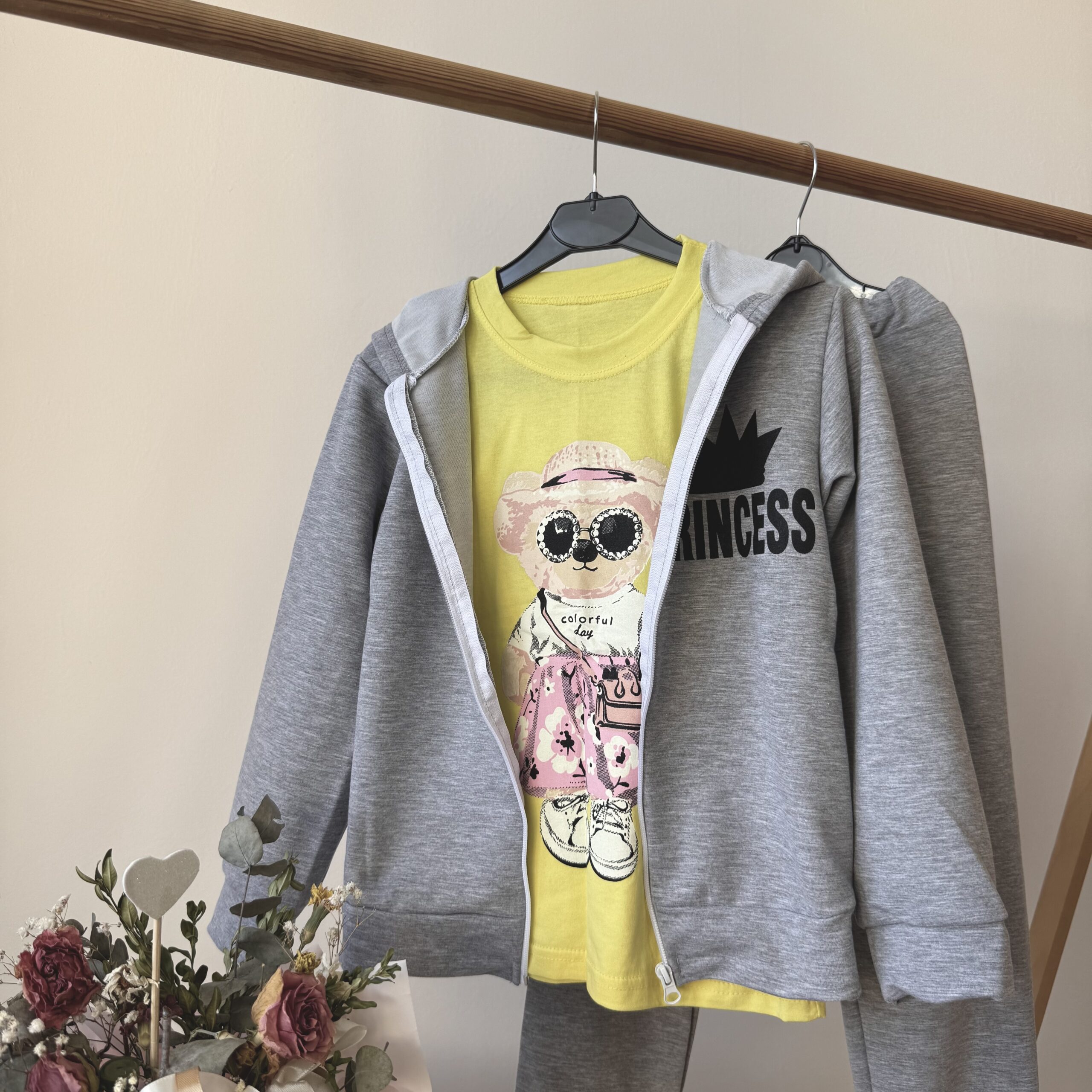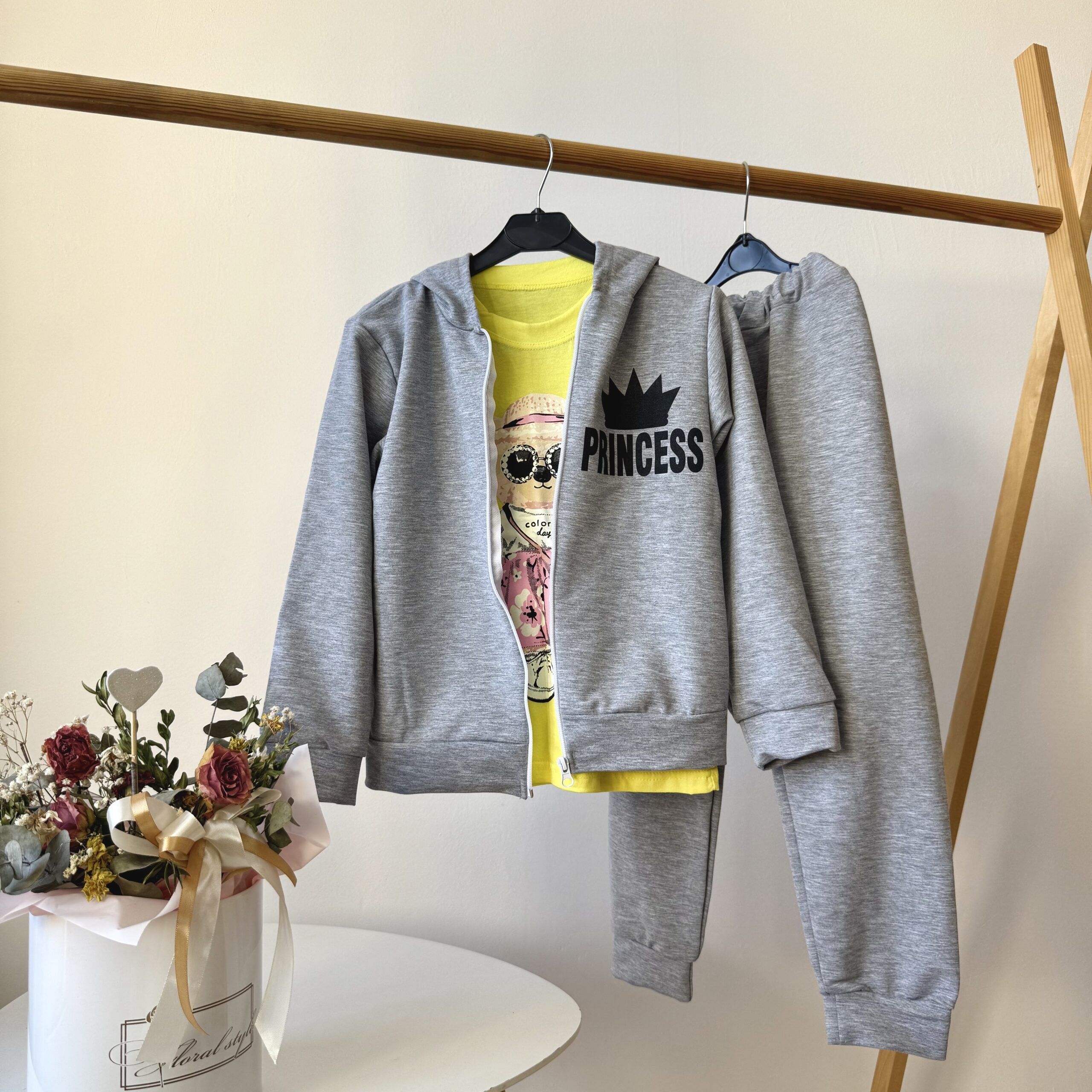 Кофта на блискавці з капюшоном, футболка – малюнок накат. Штани з гарною посадкою, знизу на манжети. Чудово підійде для уроків фізичної культури!