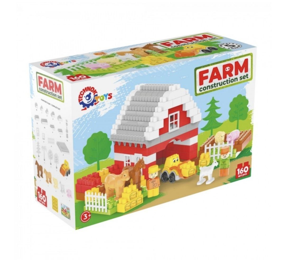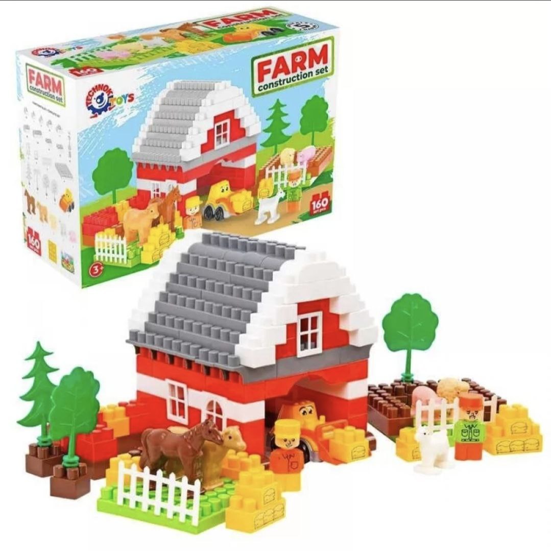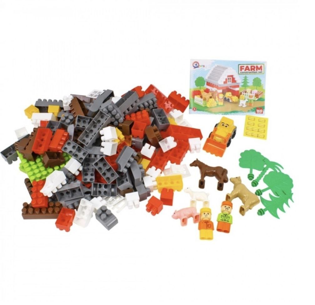 У наборі 160 деталей, з яких можна створити просторий ангар для техніки, затишний будиночок для тварин і житло для фермерів. Зелені галявини, високі дерева й безпечна огорожа зроблять ферму ідеальним місцем для гри. Мешканці ферми: грайливий кінь, мила овечка, доброзичлива корівка, прутка свинка й вередлива коза. Усі вони мають затишні куточки та багато простору для веселих пригод. Наліпки допоможуть перетворити елементи конструктора на скирти сіна, додаючи реалістичності.