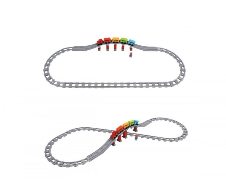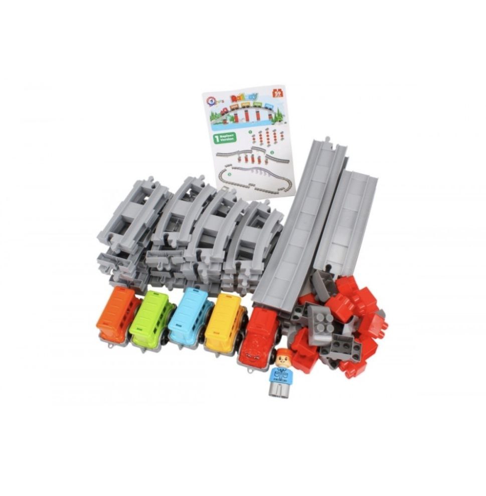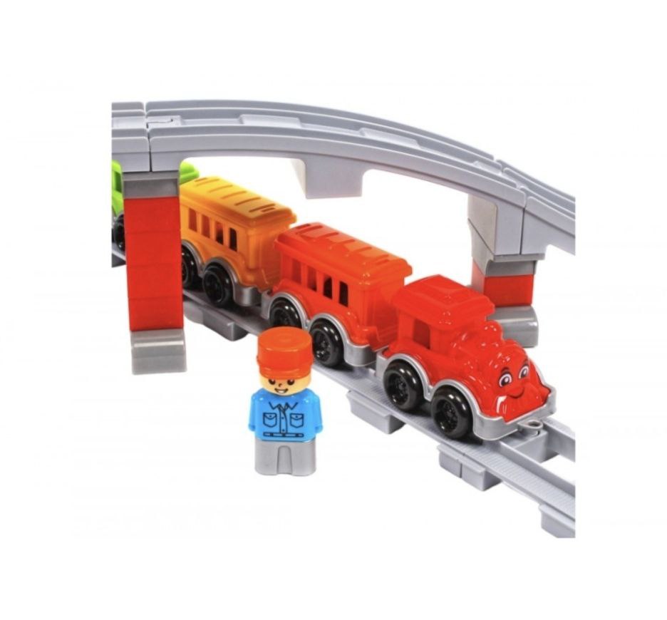 В комплекті: 59 великих і міцних елементів: локомотив і вагони, міст з опорами, фігурка залізничника та різні секції колії. Завдяки прямим, вигнутим і довгим дугам довжина шляху сягає близько 3,86 м, а за альтернативної розкладки — до 4,38 м. Деталі приємні на дотик, легко з’єднуються й роз’єднуються.