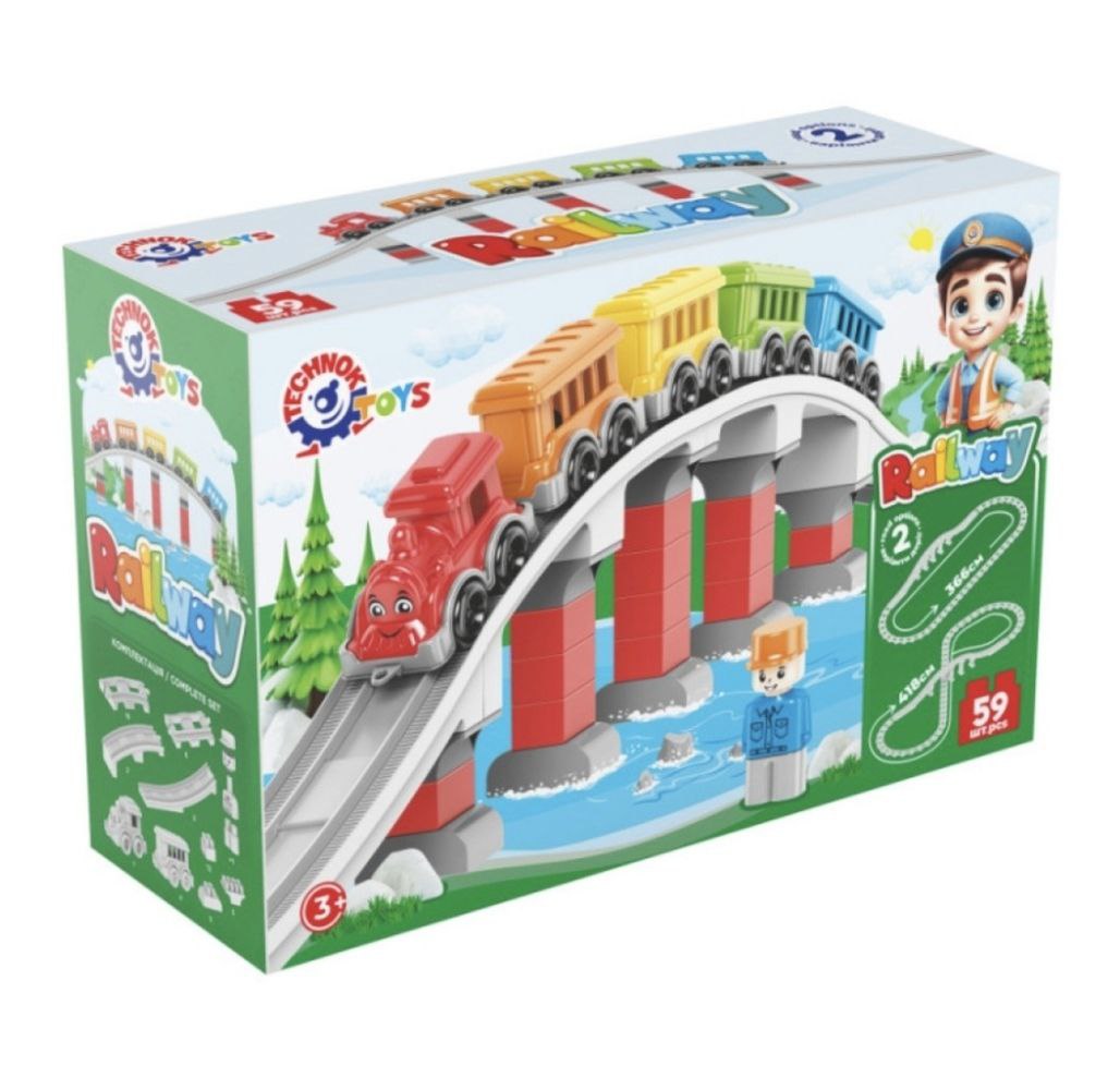 Конструктор «Залізниця TechnoK» — яскравий набір для дітей від 3 років. Малюк збирає власну колію, веде локомотив із чотирма вагонами через міст і обирає конфігурацію маршруту: коло, овал, «вісімку» чи довгу трасу. Гра розвиває дрібну моторику, логічне та просторове мислення, заохочує до спільної гри з батьками та друзями.
