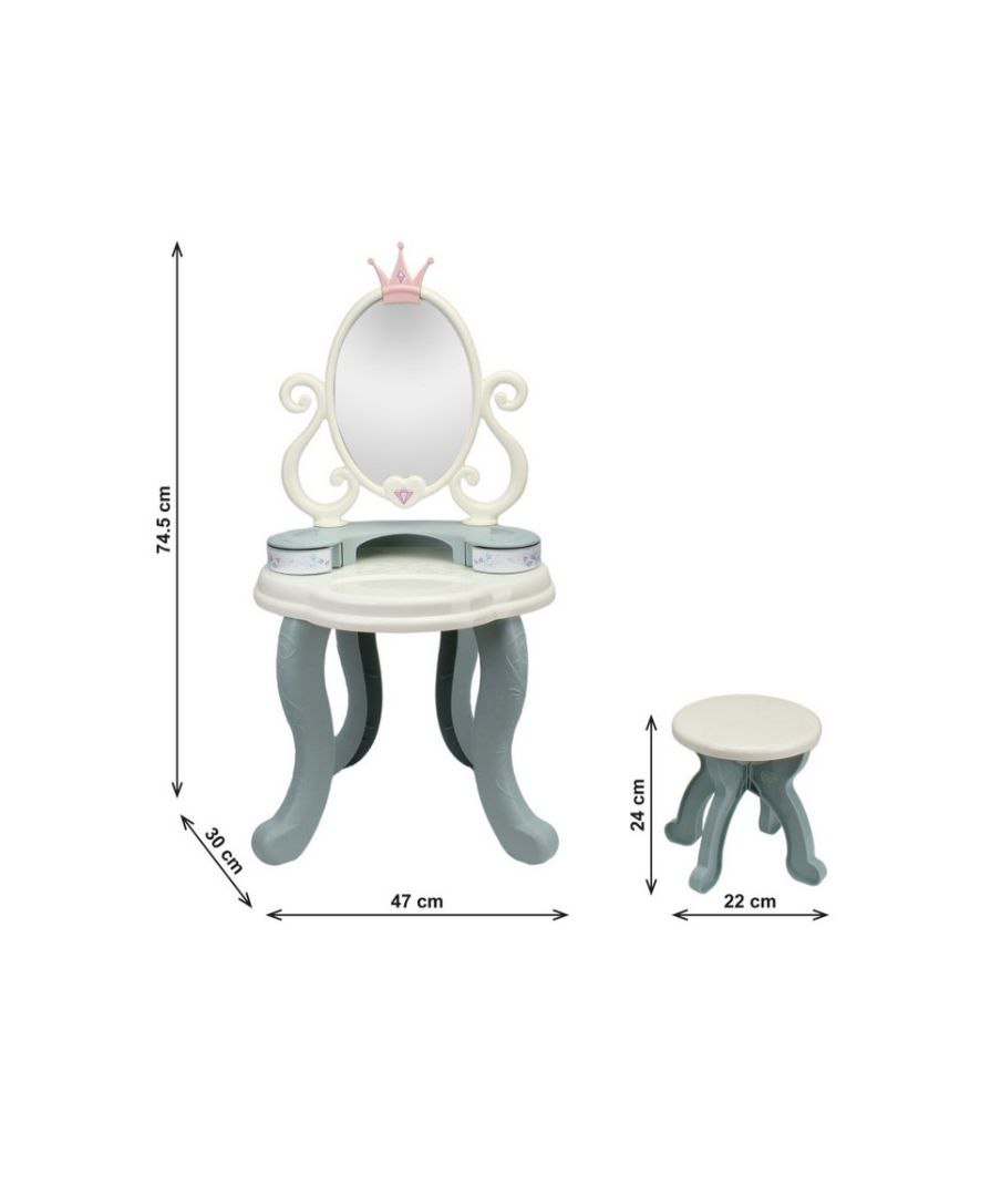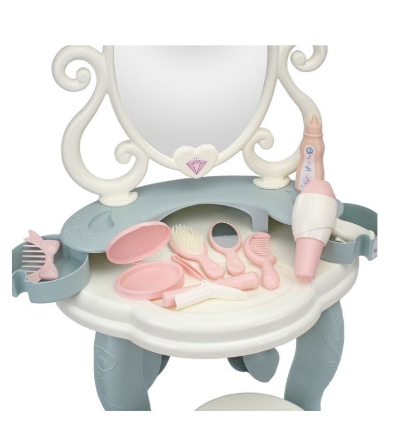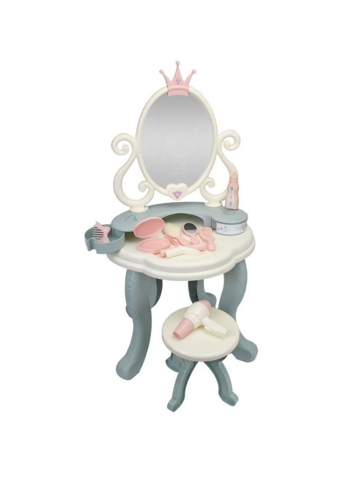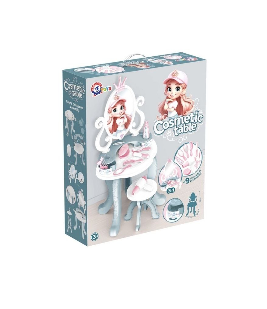 Косметичний столик зі стільцем ТехноК — стильний набір для маленьких модниць, що мріють про власний куточок краси. Завдяки великому безпечному дзеркалу, зручному табурету та практичним відділенням для зберігання аксесуарів, дитина зможе грати у візажиста чи перукаря, створювати зачіски та образи.У комплекті є 9 аксесуарів: гребінець, щітка, ручне дзеркальце, пінцет, заколка-гребінець, плойка, пудрениця, фен і тюбик крему. Набір допомагає розвивати уяву, творчі здібності, дрібну моторику та соціальні навички через рольові ігри. Казковий дизайн та ніжна кольорова гама роблять столик справжньою прикрасою дитячої кімнати.