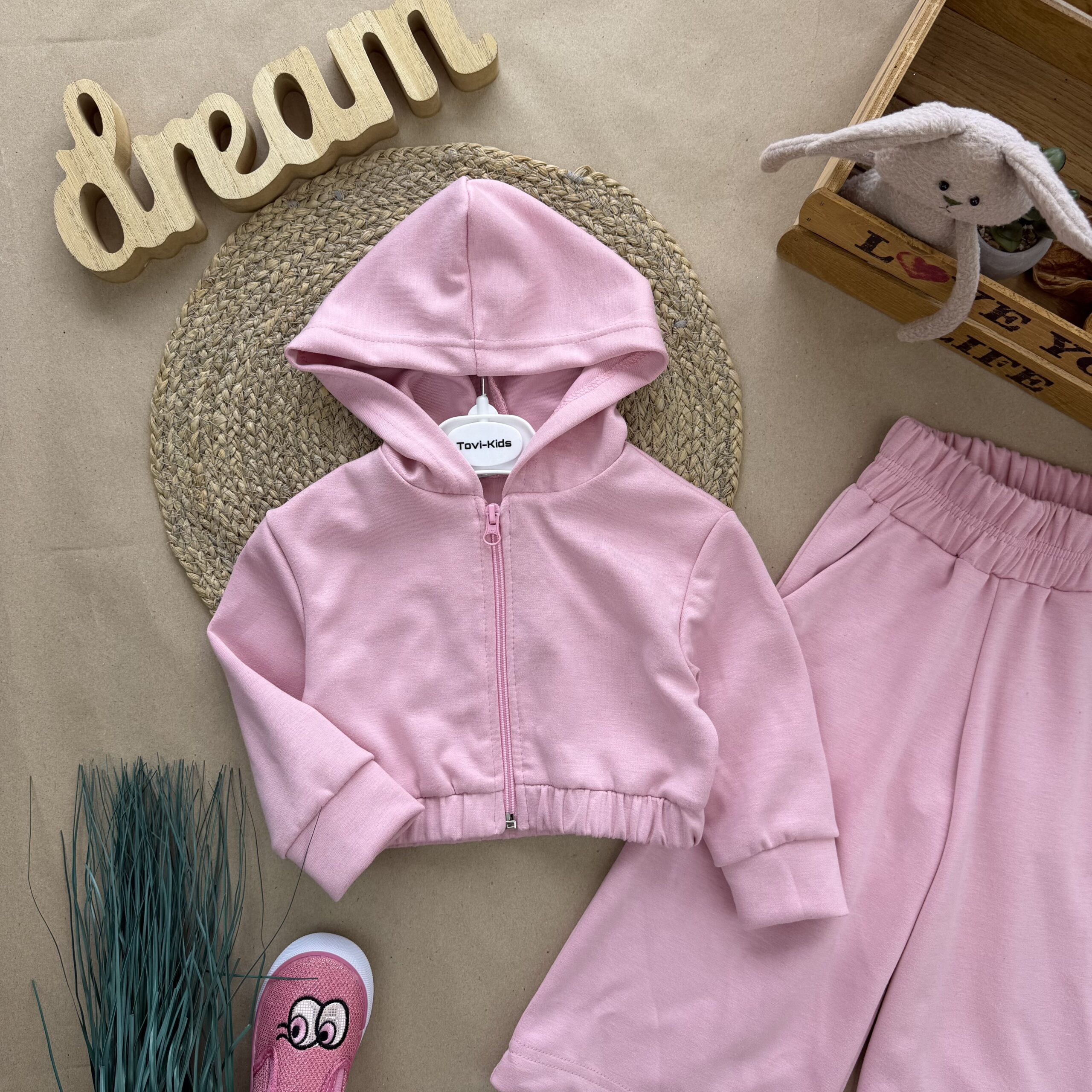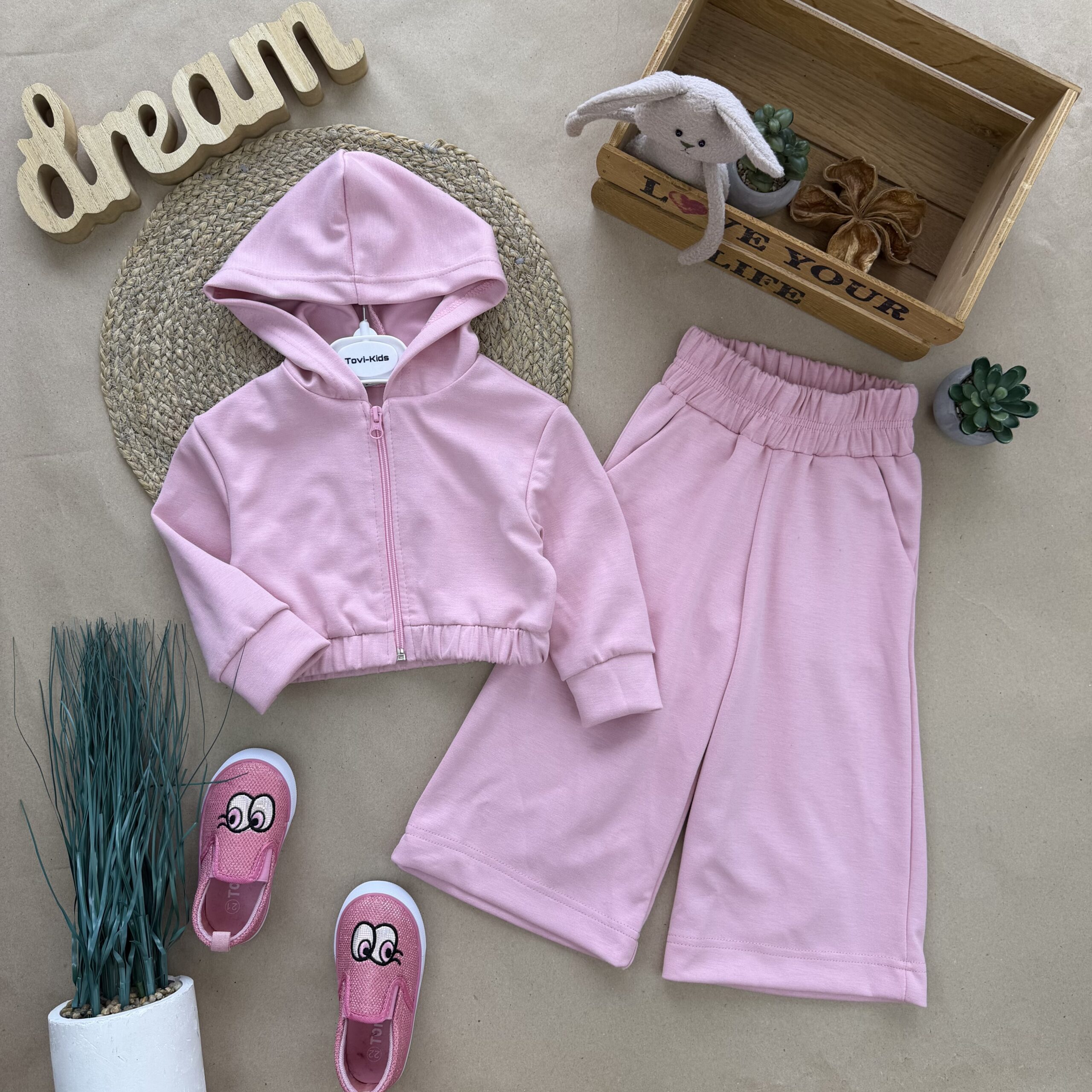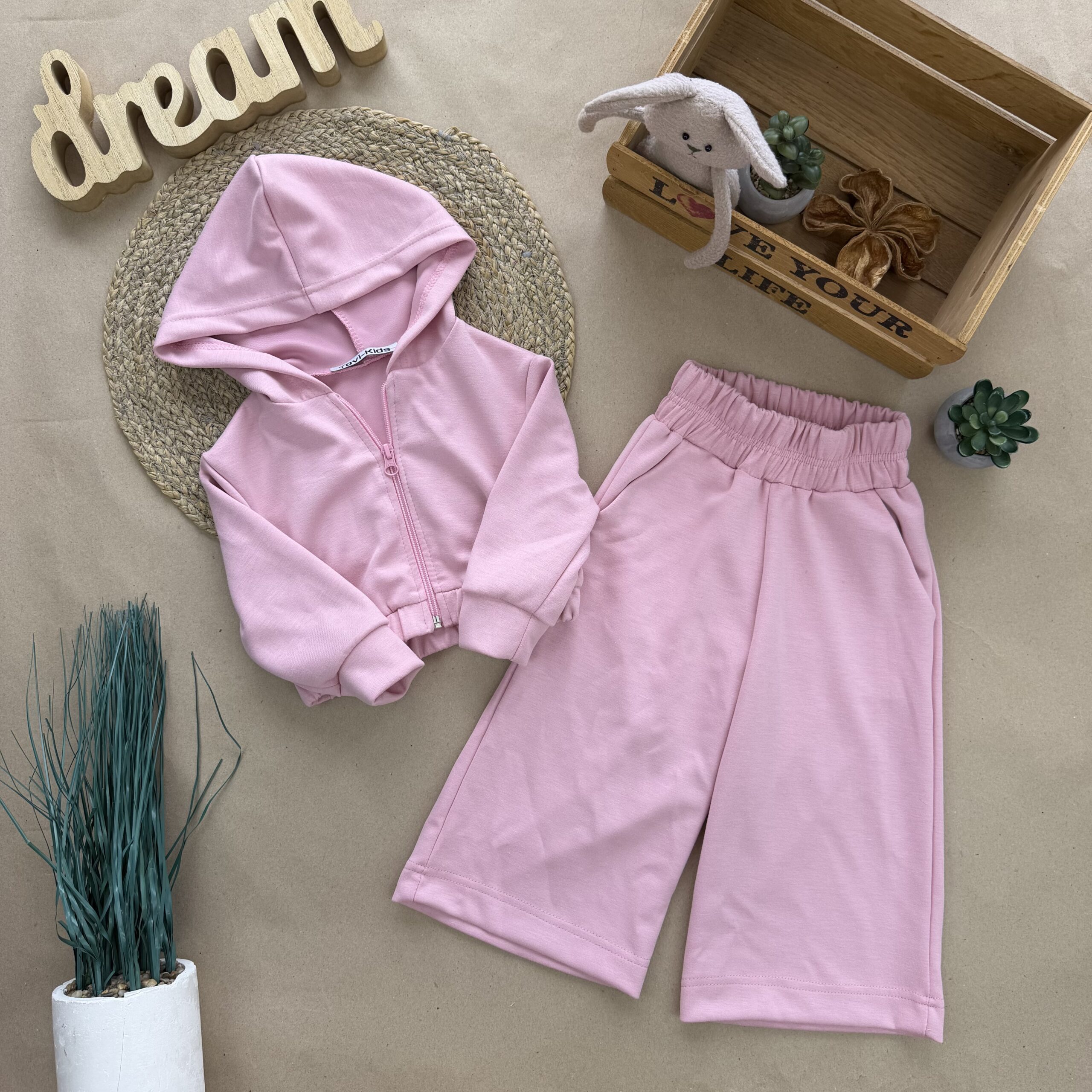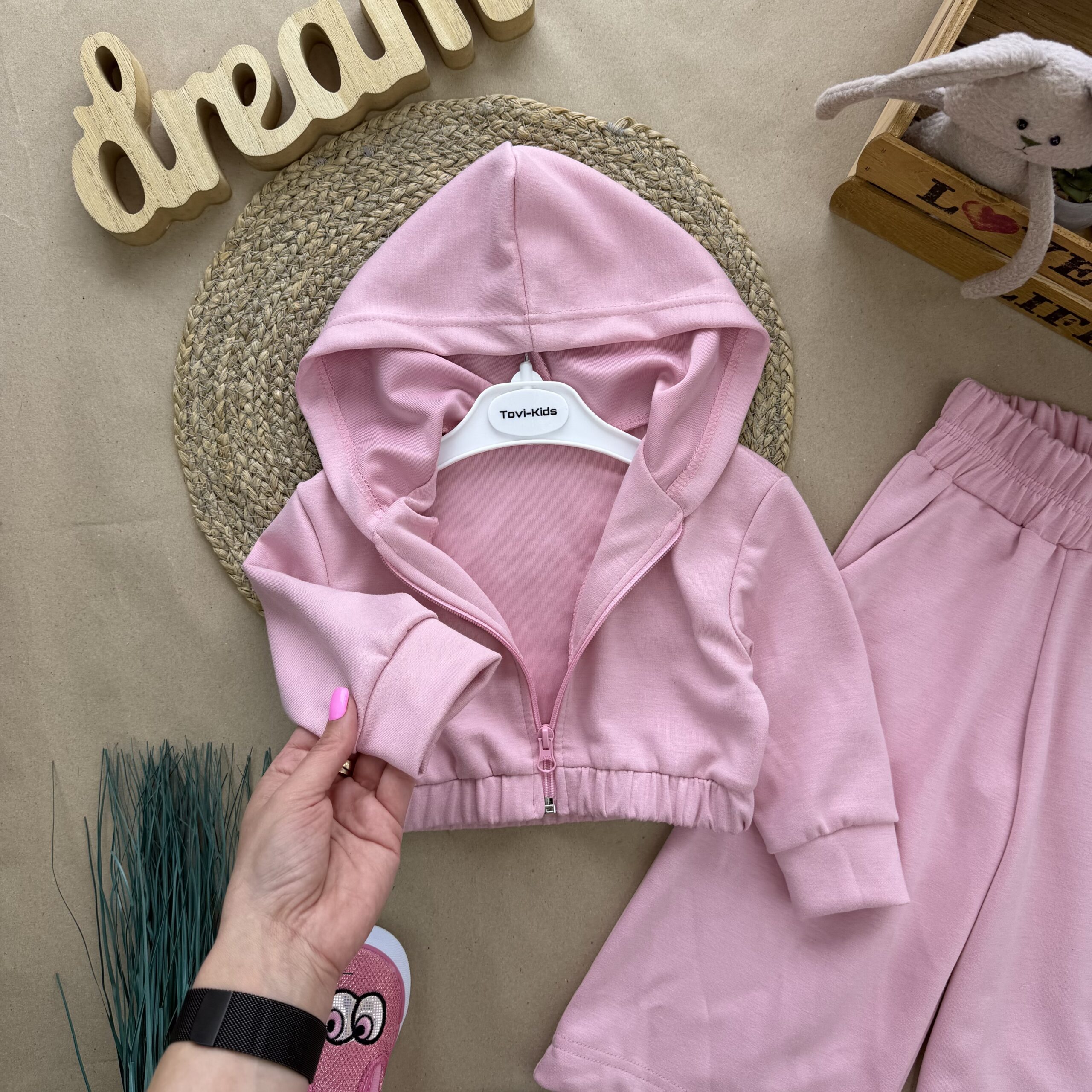 Стильний весняний костюм власного виробництва! Тканина ойшо Туреччина (візуально схожа на двунитку, але мʼякша та ніжна на дотик) Не кашлатиться, не втрачає форму та колір при пранні. Кофта з капюшоном на застібці блискавці. Штани палацо з кишенями.