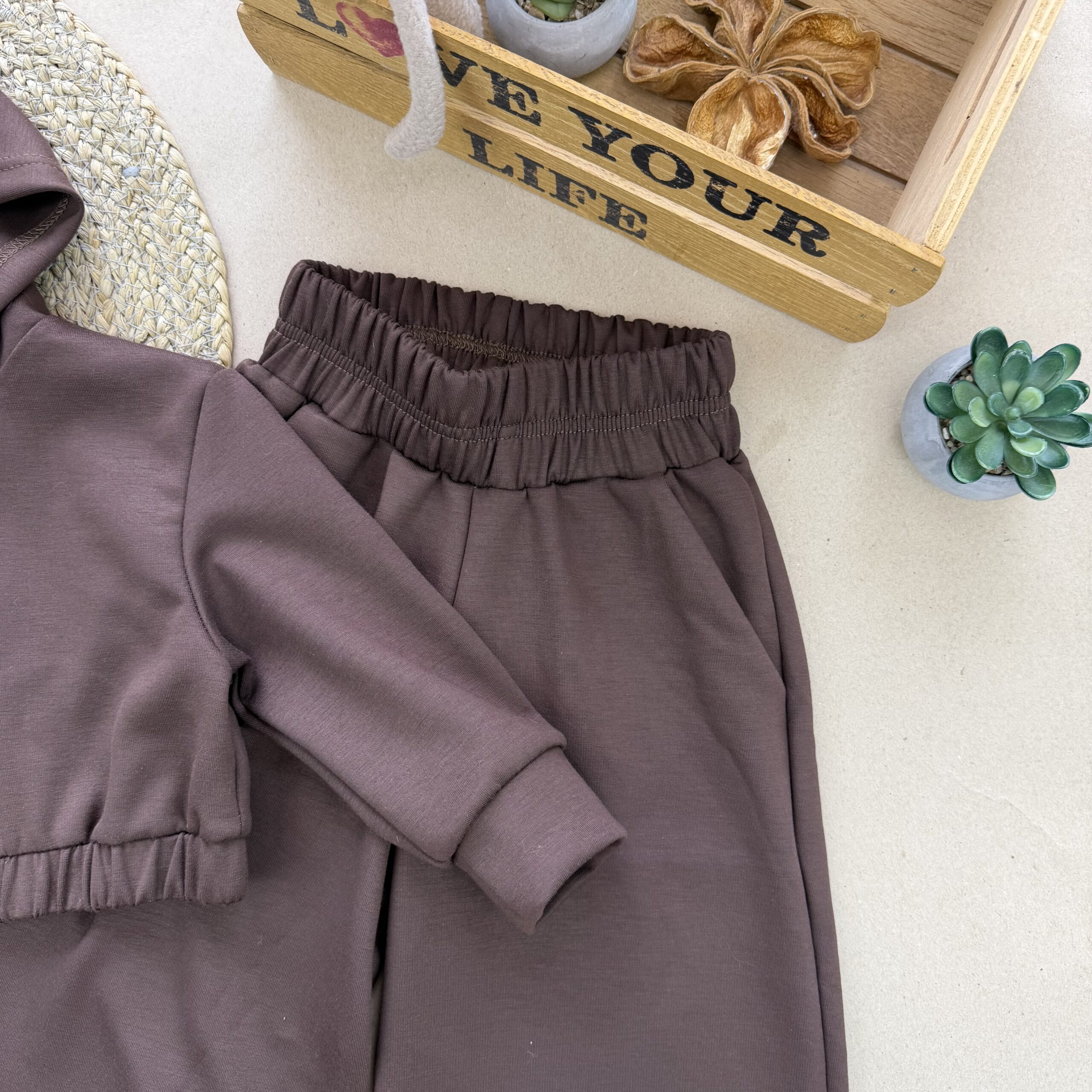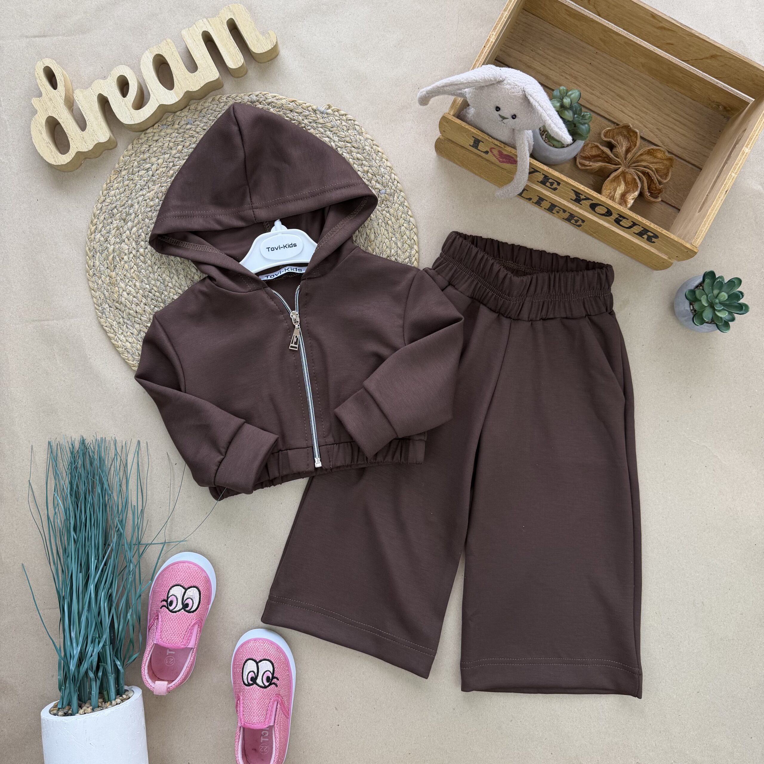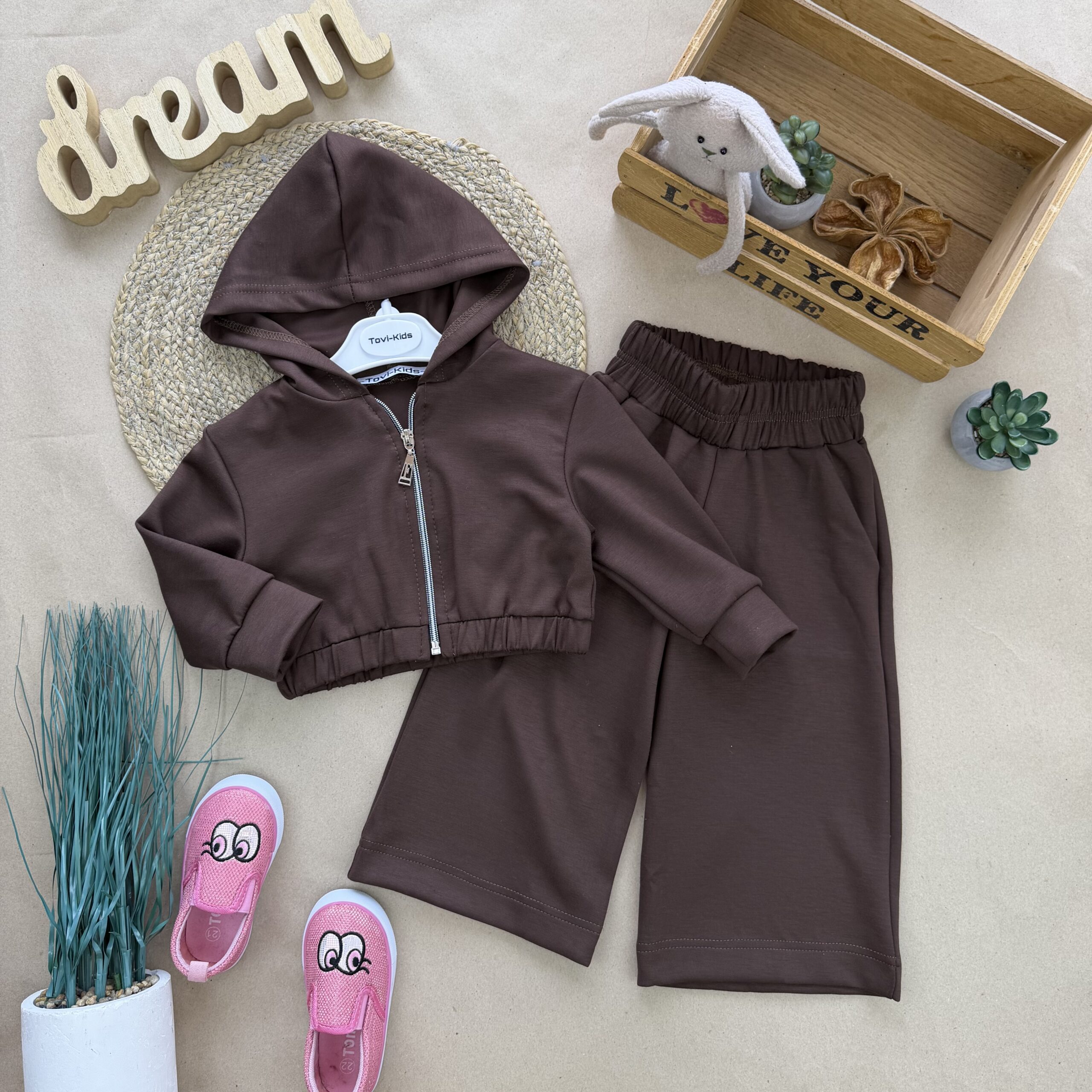 Стильний весняний костюм власного виробництва! Тканина ойшо Туреччина (візуально схожа на двунитку, але мʼякша та ніжна на дотик) Не кашлатиться, не втрачає форму та колір при пранні. Кофта з капюшоном на застібці блискавці. Штани палацо з кишенями.