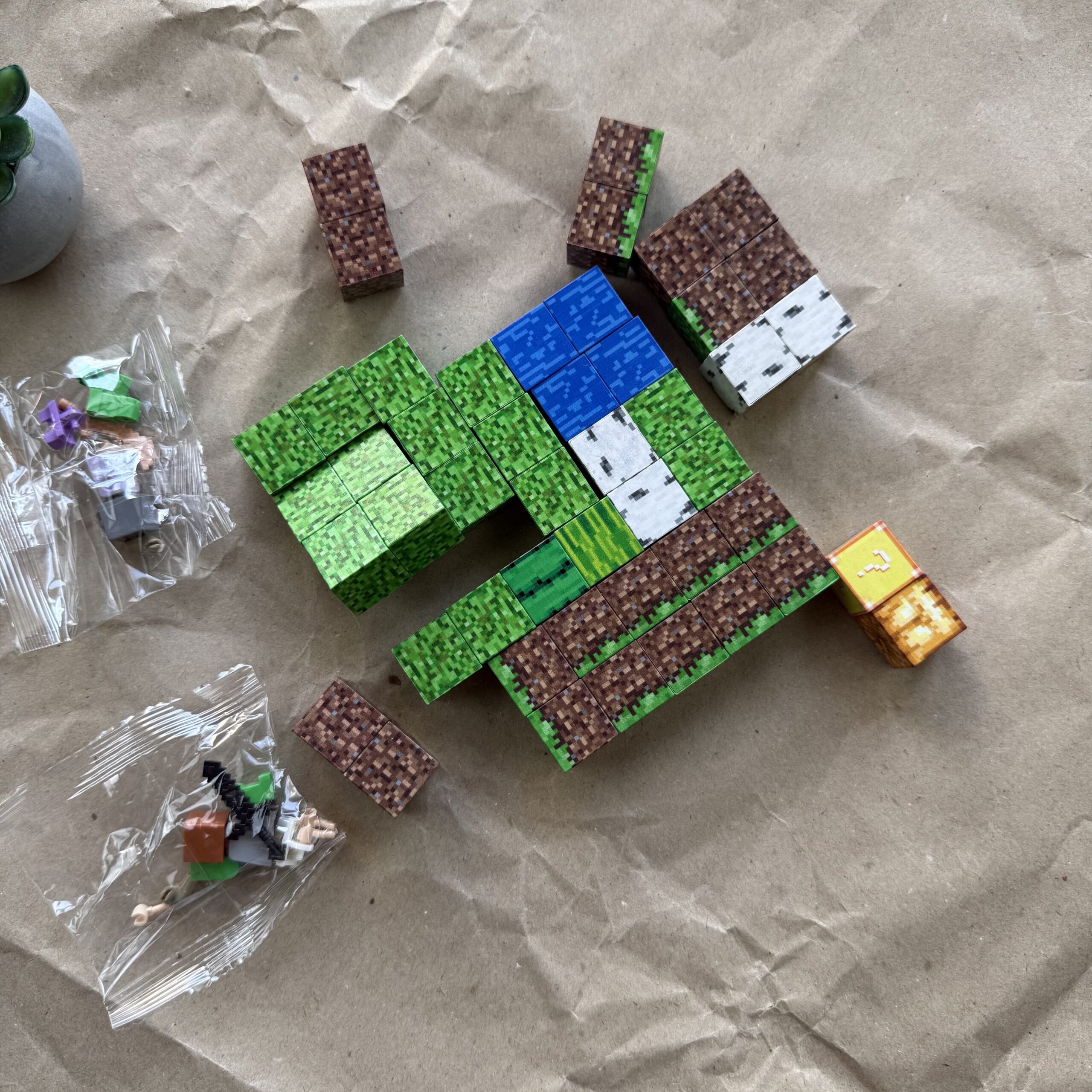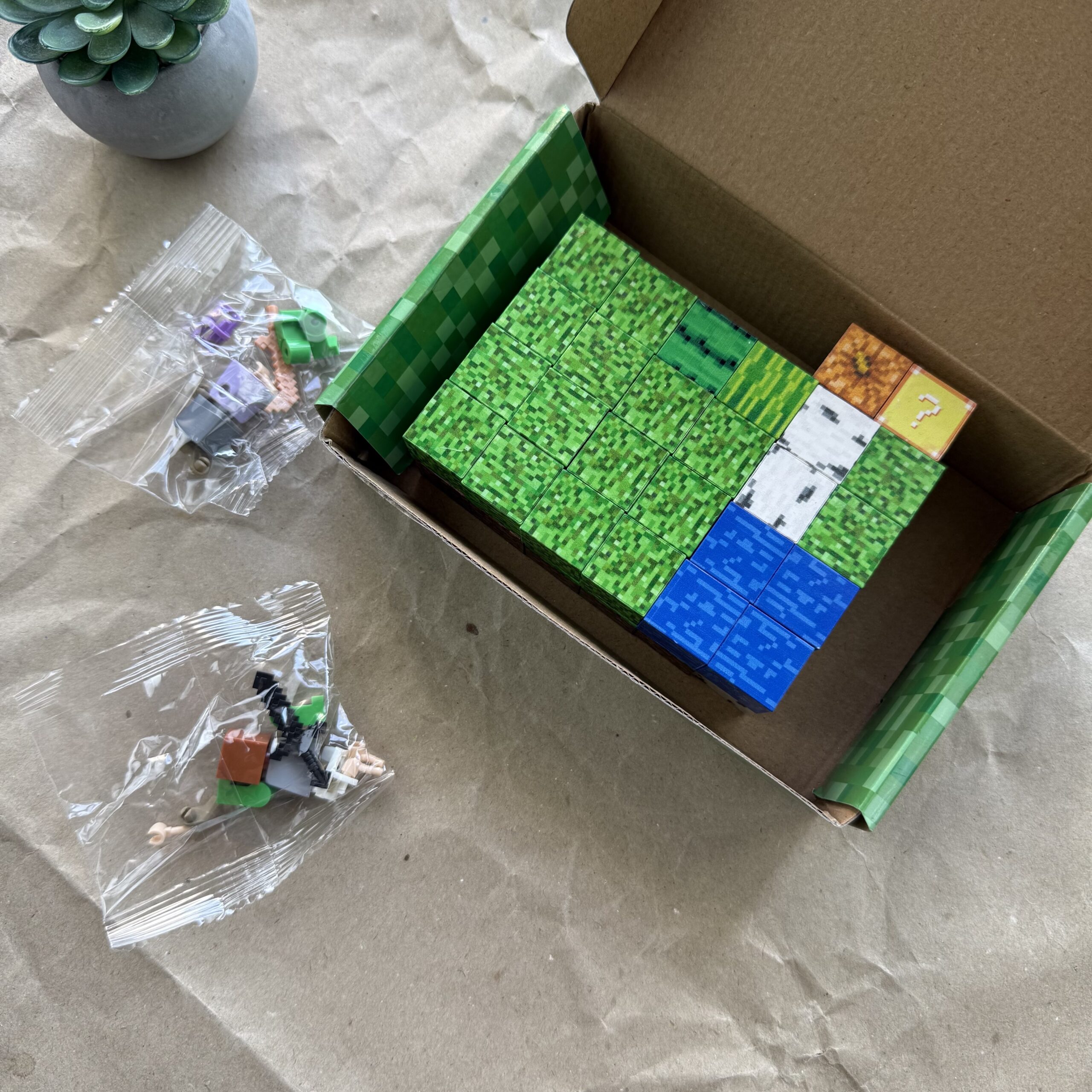 Цей набір включає 47-48 кубиків Майнкрафт та аксесуари фігурки