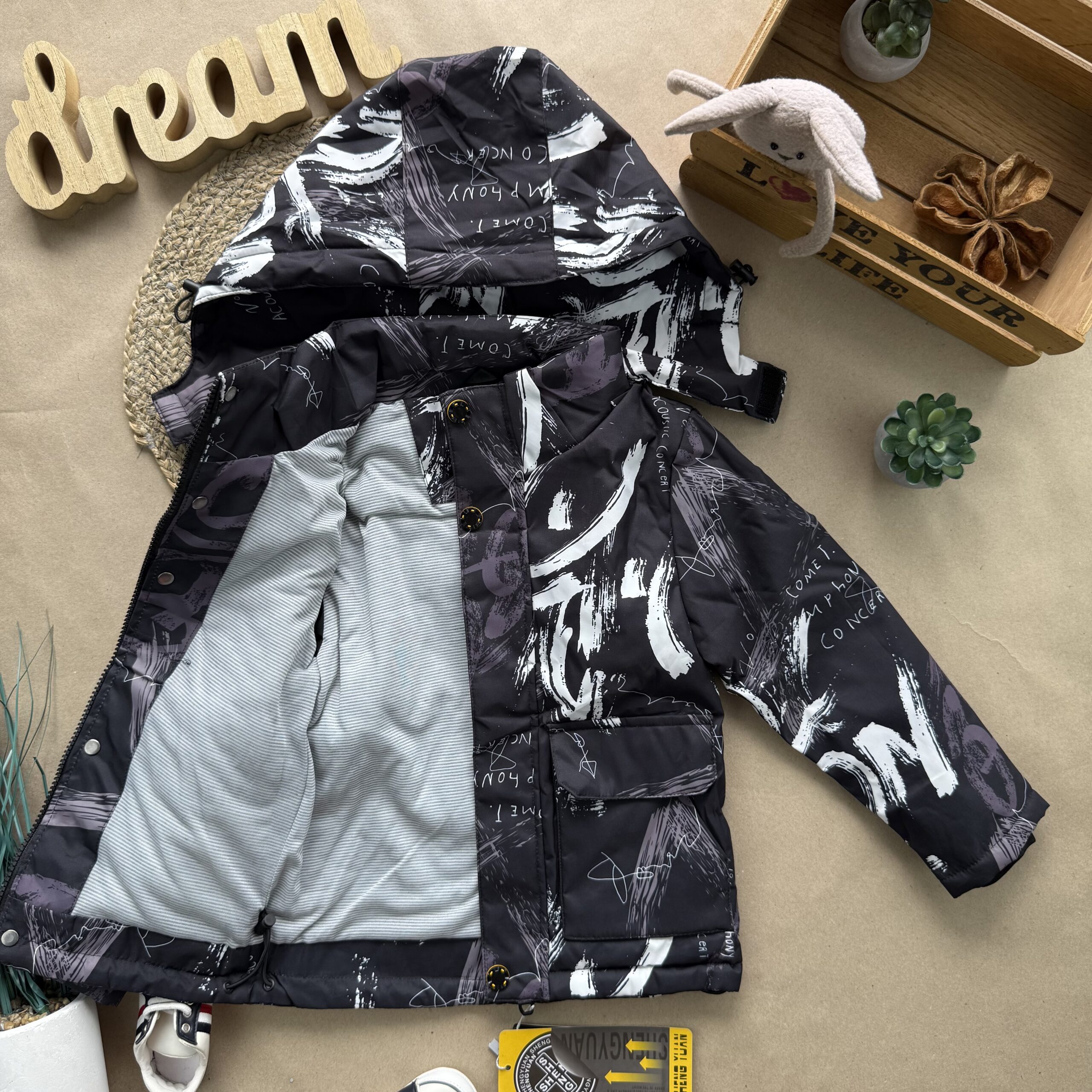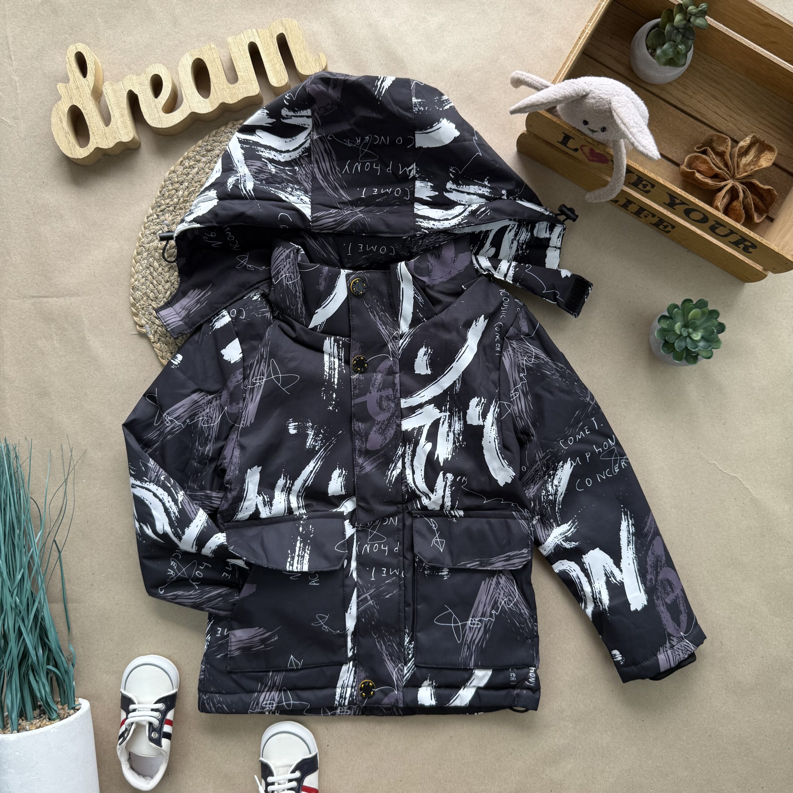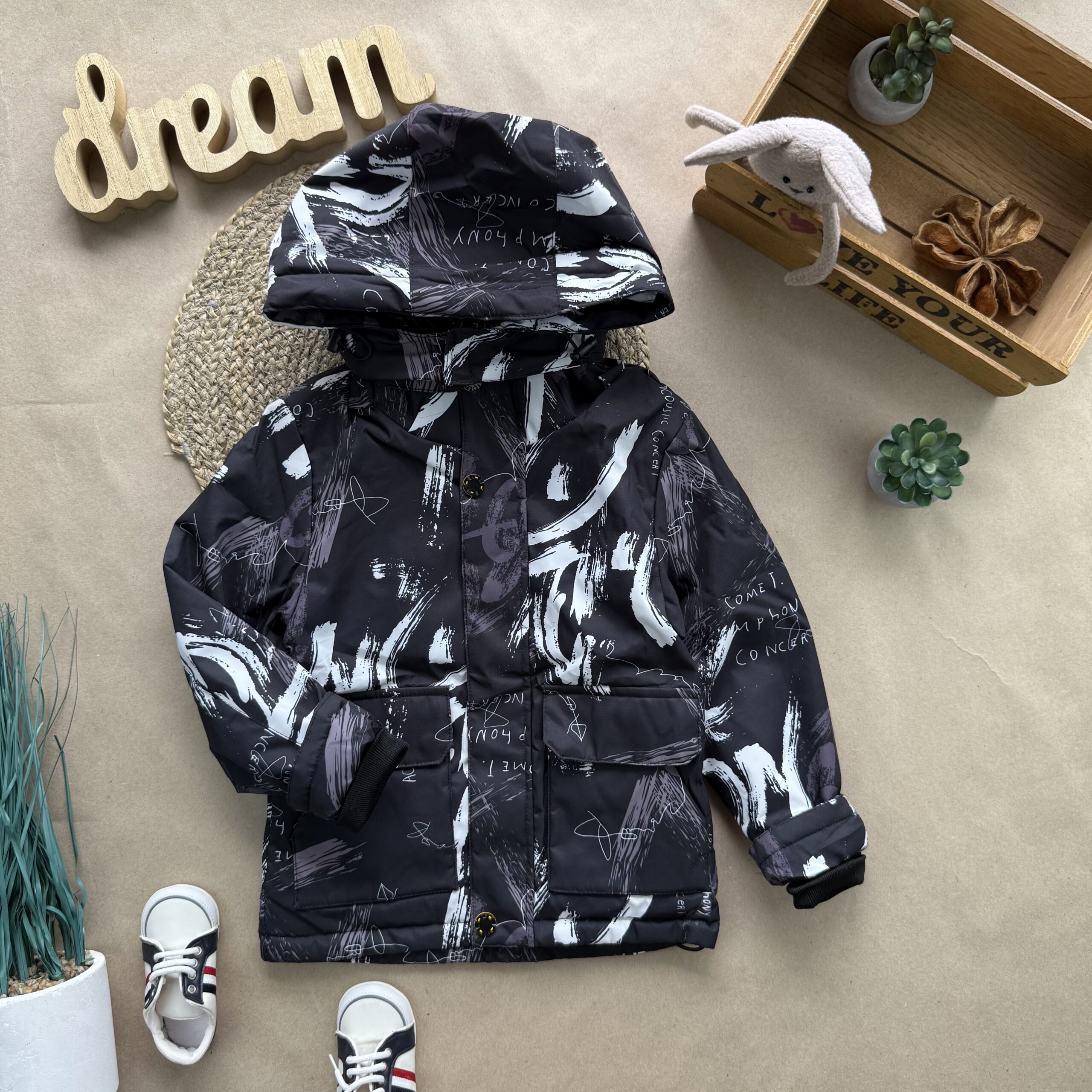 Модна куртка з принтом для хлопчика – поєнання комфорту й стилю. Завдяки капюшону та зручним трикотажним манжетам малюк буде почуватися комфортно навіть у прохолодну погоду. Накладні кишені стануть у пригоді для дрібничок чи зігрівання рук.