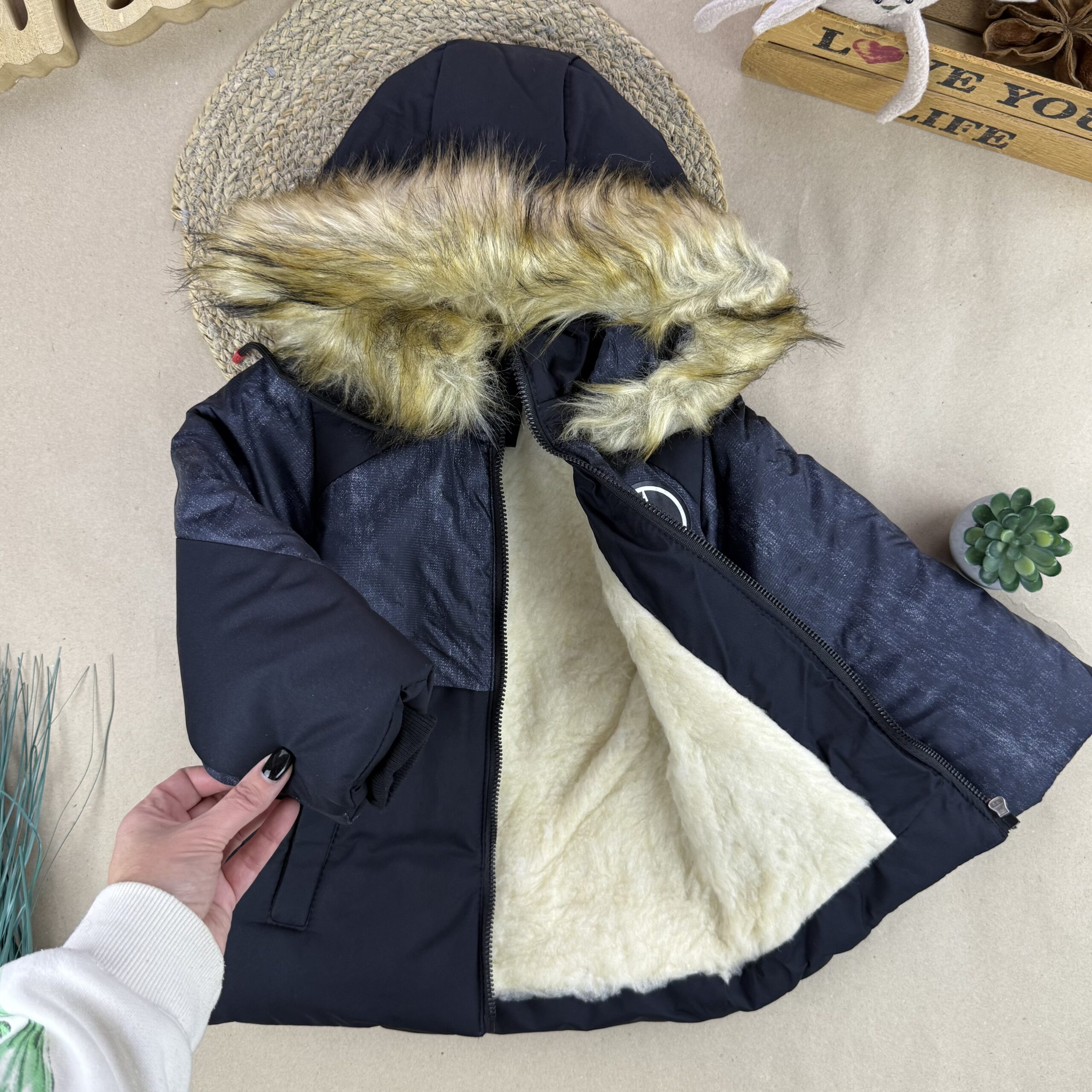 Верх – водовідштовхувальна болонь, усередині – овчина. Капюшон відстібається, оздоблений хутром. Дві кишені з блискавкою та трикотажні манжети в рукавах для максимального комфорту.