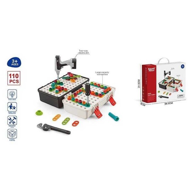 Тематична мозаїка для розвитку фантазійного та креативного мислення вашої дитини! Включає 2 види кольорових деталей (шурупи та пластини), які дозволяють створювати фігури у 2D та 3D форматі! До комплекту входять всі необхідні інструменти для зручної роботи з кріпленням – електричний шуруповерт, викрутка, розвідний ключ. Особливості: – 3D-мозаїка у вигляді валізи з інструментами; – включає 110 деталей; – валізка має отвори та виконує роль ігрової панелі; – 2 види ігрових деталей: шурупи та пластини для створення об’ємних фігур; – шуруповерт, який працює від 2 батарейок типу АА (до комплекту не входять); – викрутка та розвідний ключ для зручної роботи з кріпленням; – виконана з міцного пластику. Розмір упаковки: 38.5 см × 9 см × 31.5 см