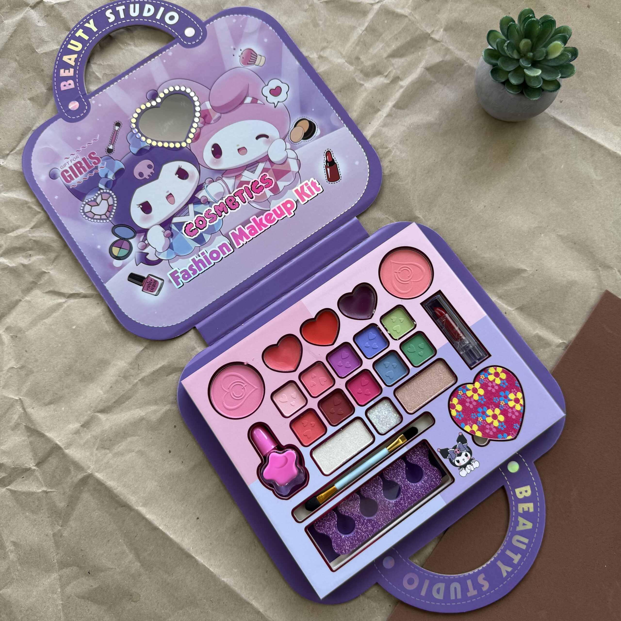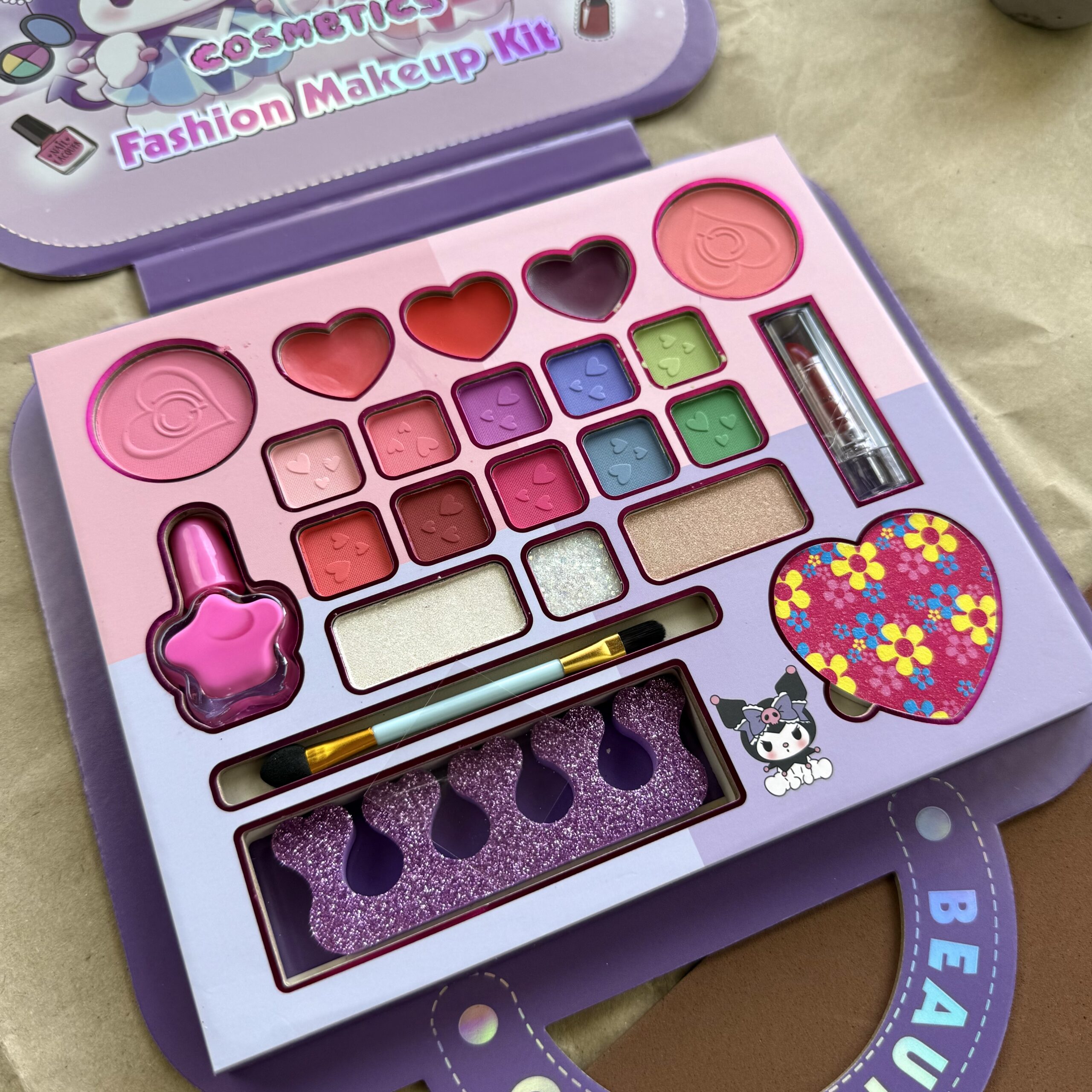Набір косметики включає: тіні, тіні із блискітками, пудра, глітер, помада, лак, пилочка, аплікатор.