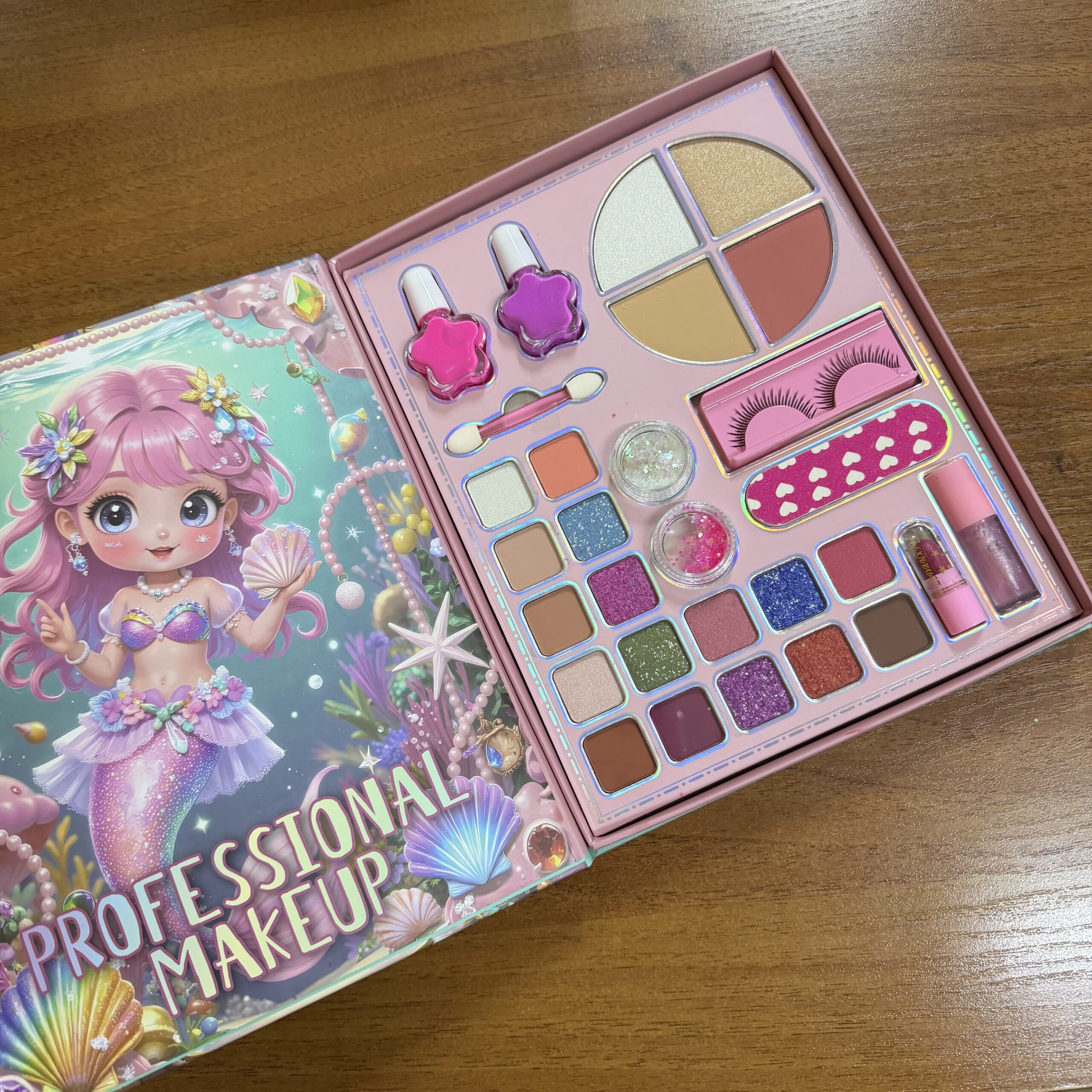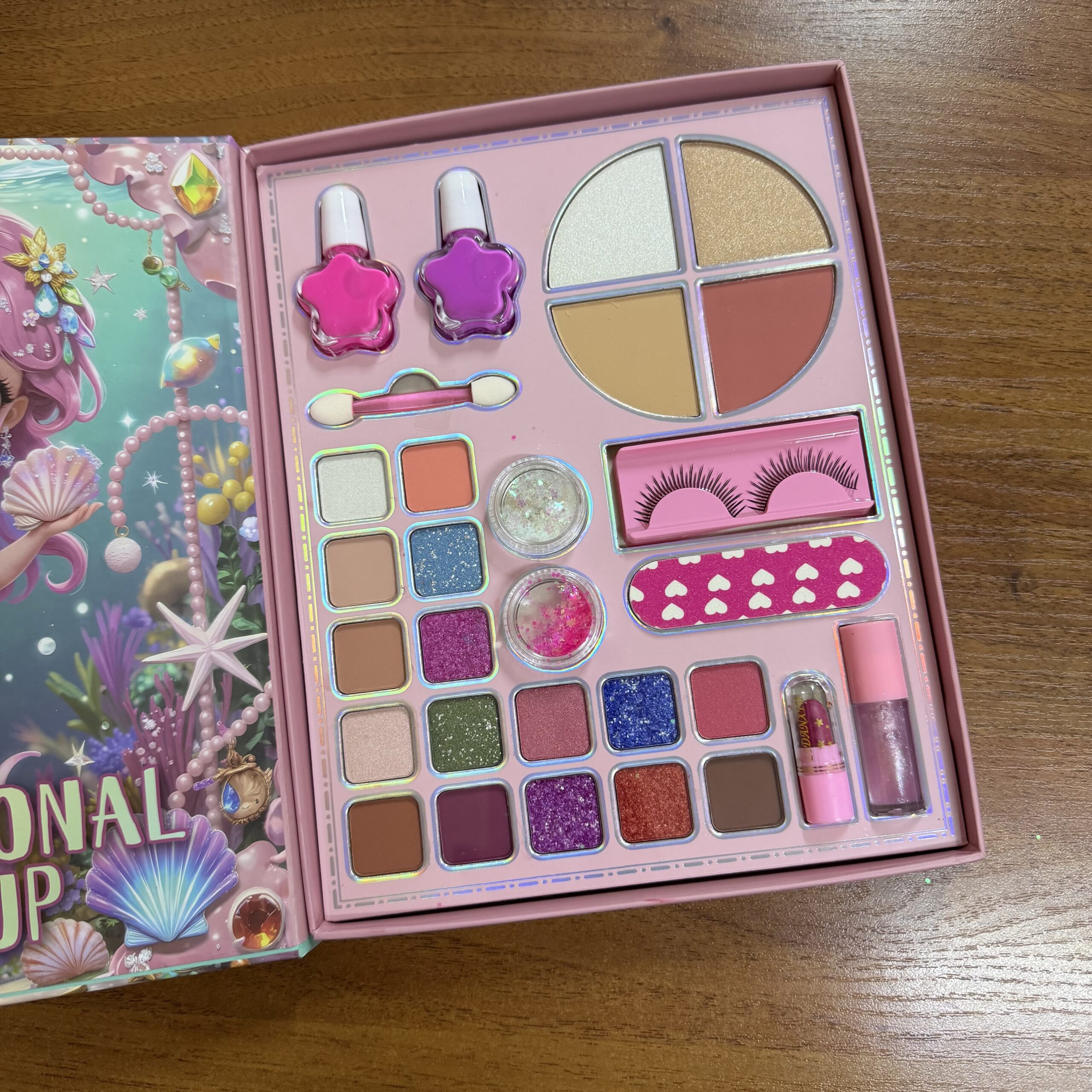 Набір косметики включає: тіні, тіні із блискітками, пудра, глітер, помада, блиск для губ, лаки, пилочка, аплікатор,вії.