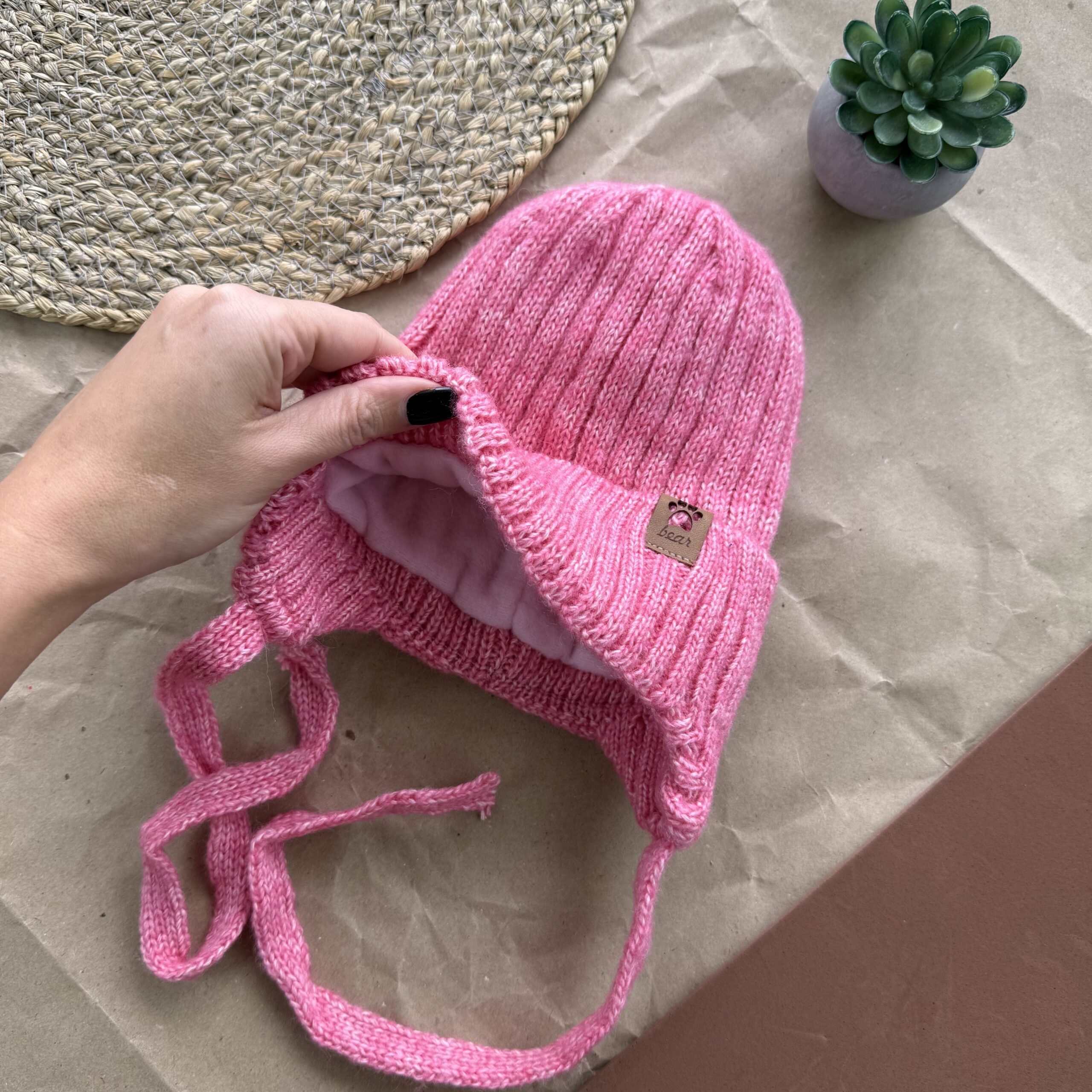 Тепла зимова шапка із крупною фактурною в’язкою та зав’язками. Всередині утеплена флісом.