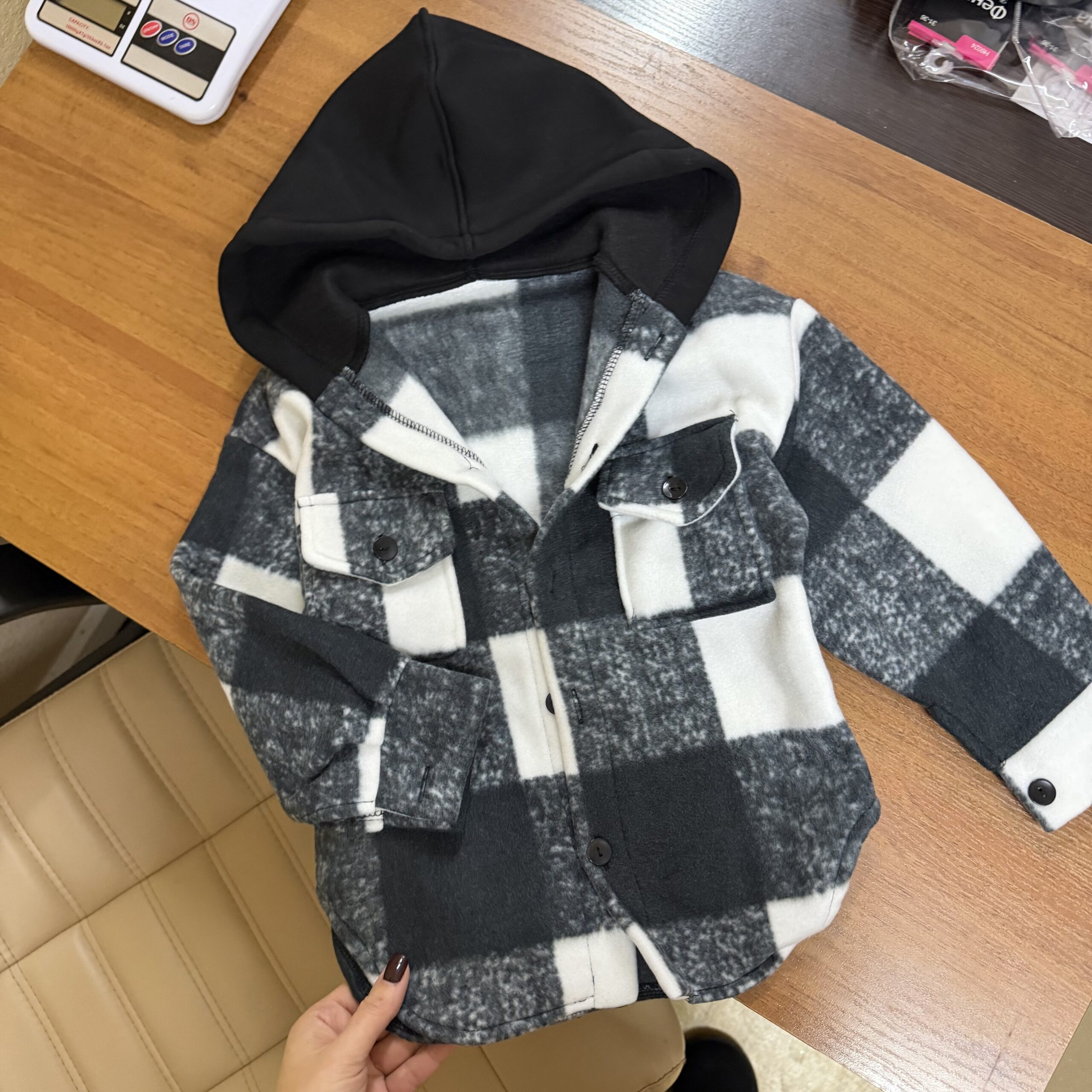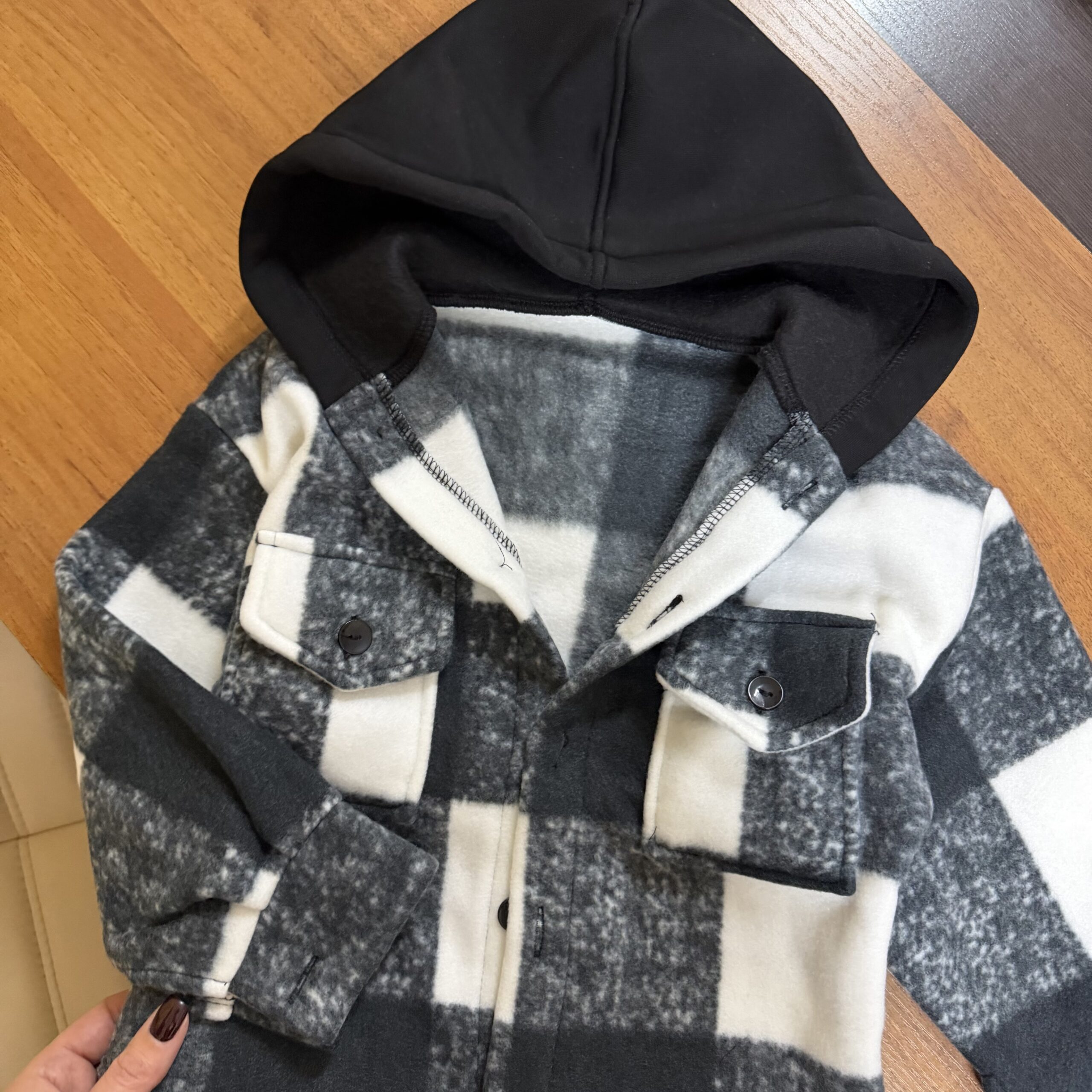 Зручна і тепла кофта з капюшоном. М'який фліс приємний до тіла, застібається на ґудзики спереду та на манжетах, дві кишені. Капюшон - тринитка. Ідеальна для прогулянок у прохолодну пору.
