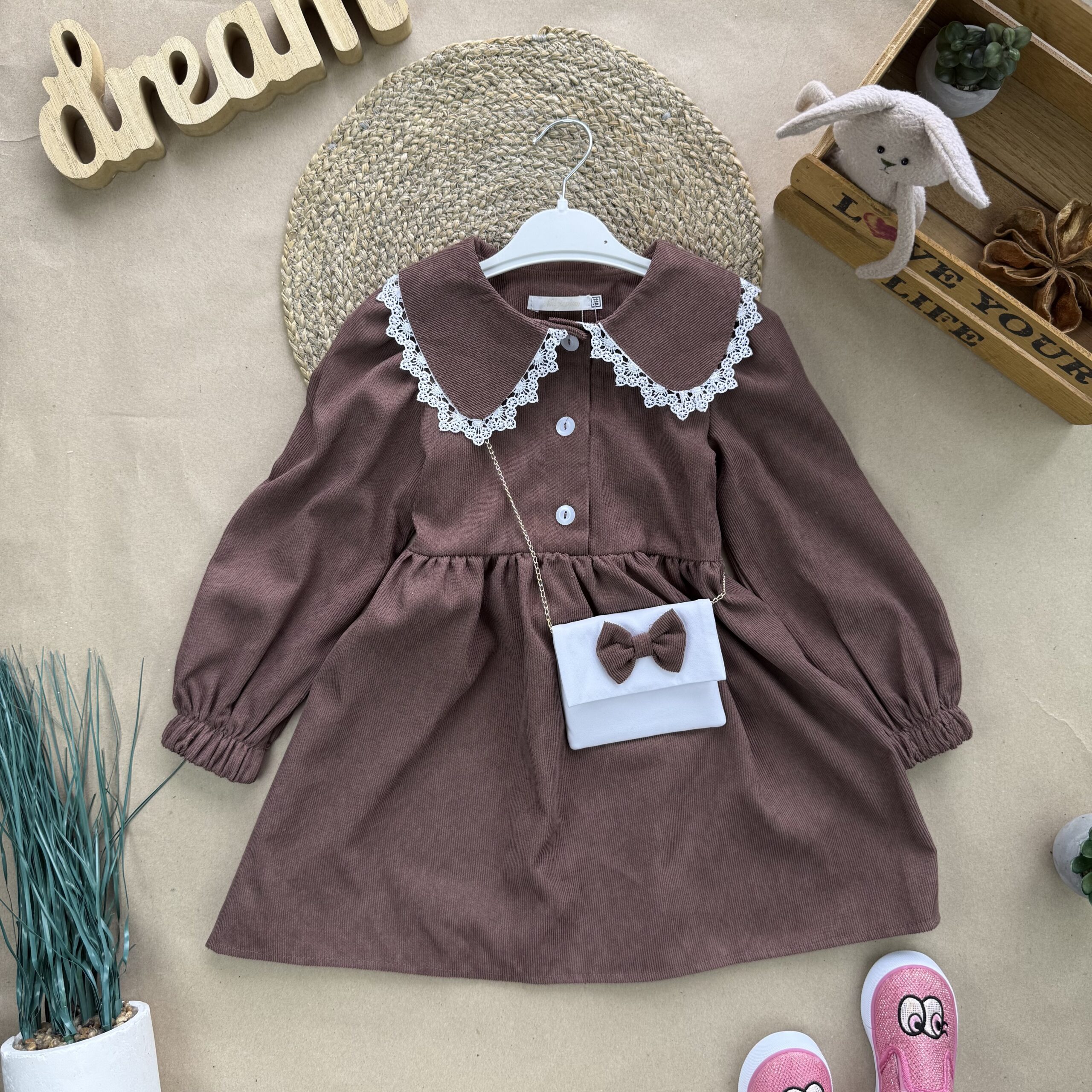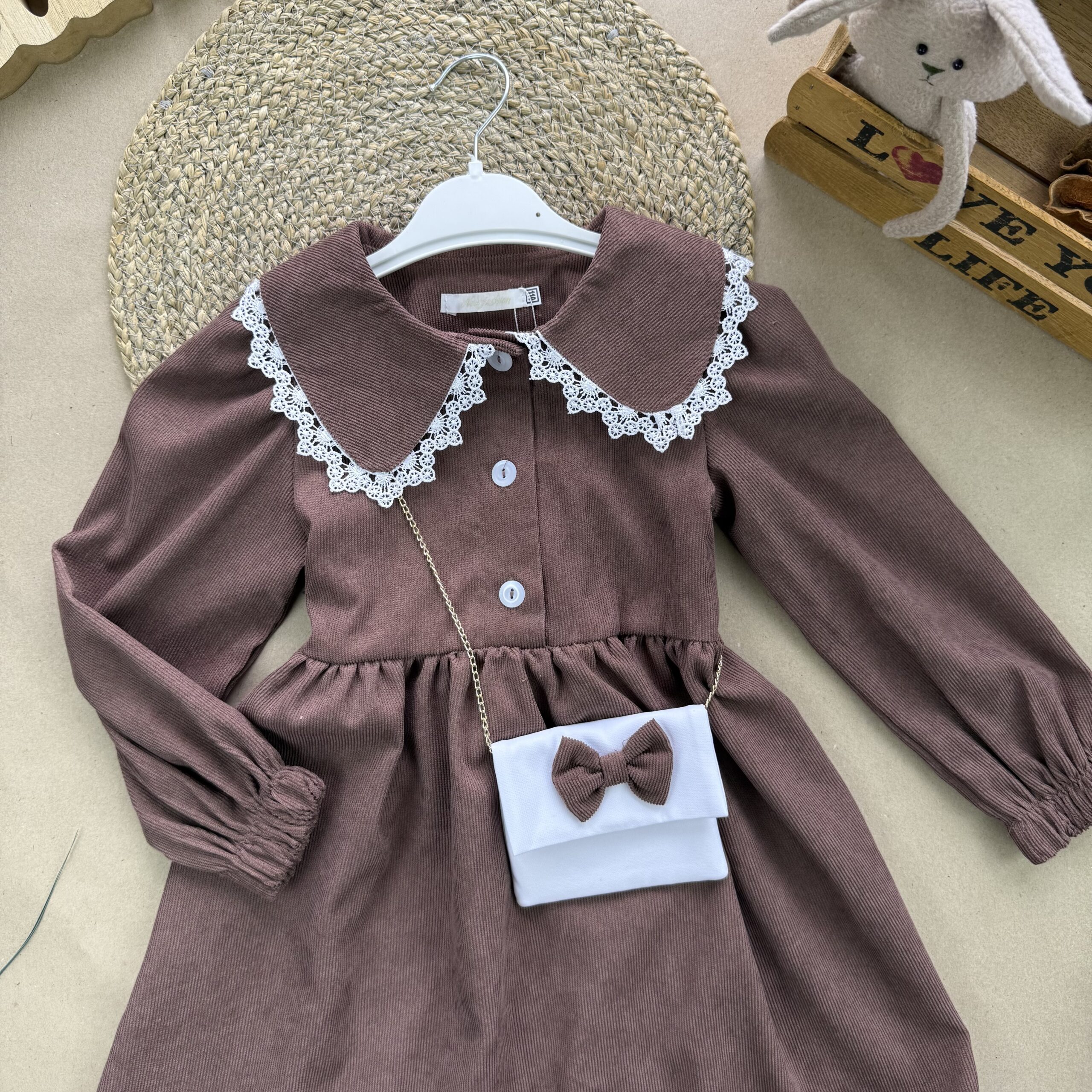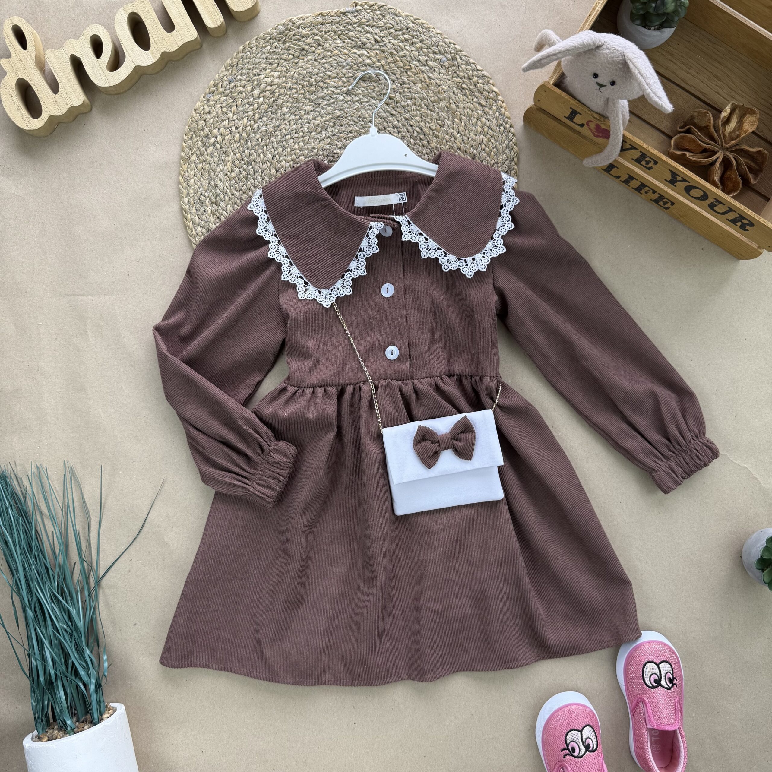 Ніжна дитяча сукня з  комірцем – втілення елегантності та зручності. Тканина – вельвет рубчик відмінної якості. Спереду – застібається на ґудзик, сзаду – пояс. Класичний дизайн і ніжні деталі роблять образ витонченим і святковим! В комплекті – сумочка.