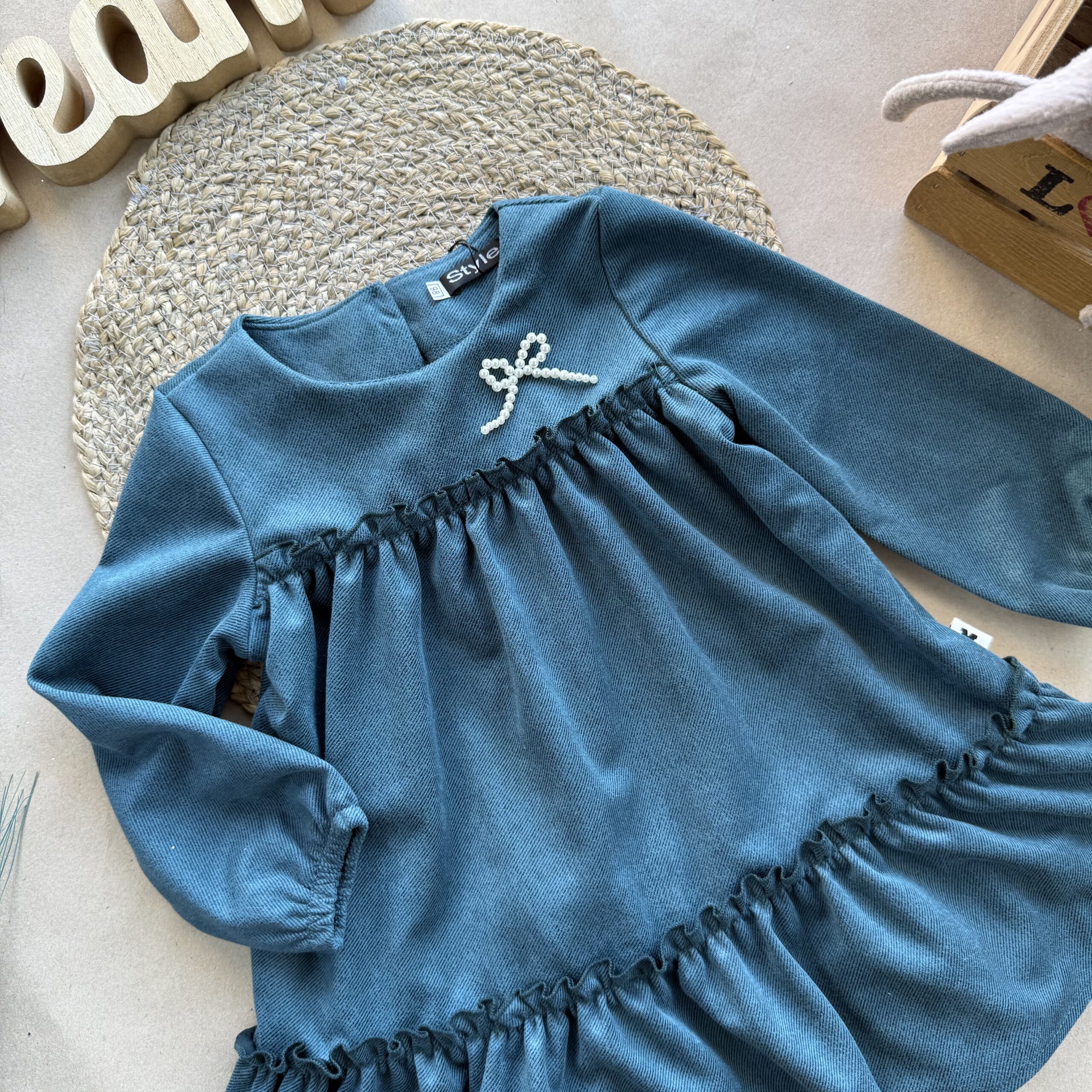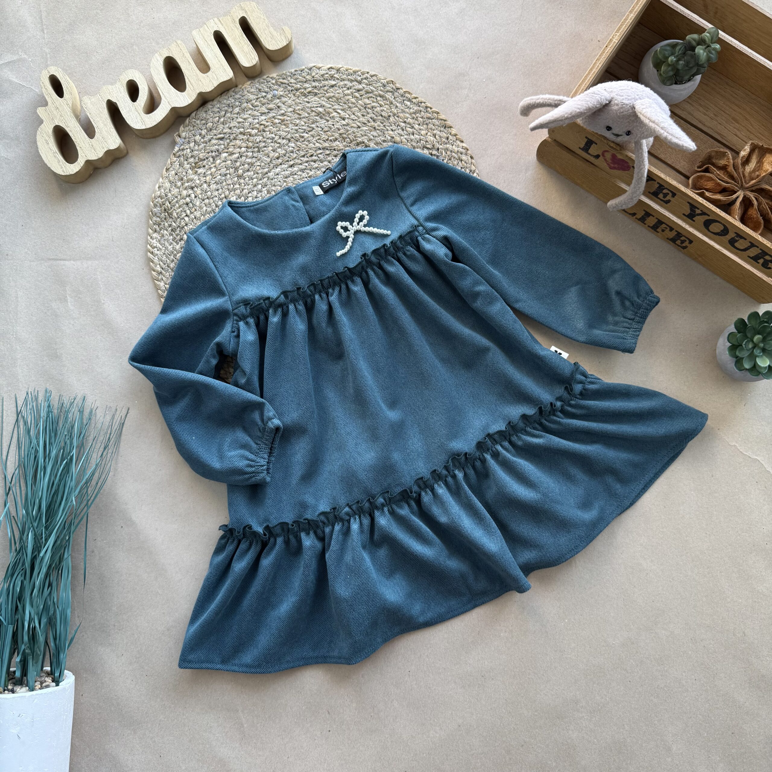 Ніжна дитяча сукня. М’яка оксамитова тканина (замш на трикотажній основі) приємна до тіла. Прикрашена рюшами та бантиком. Гарно тримає форму.