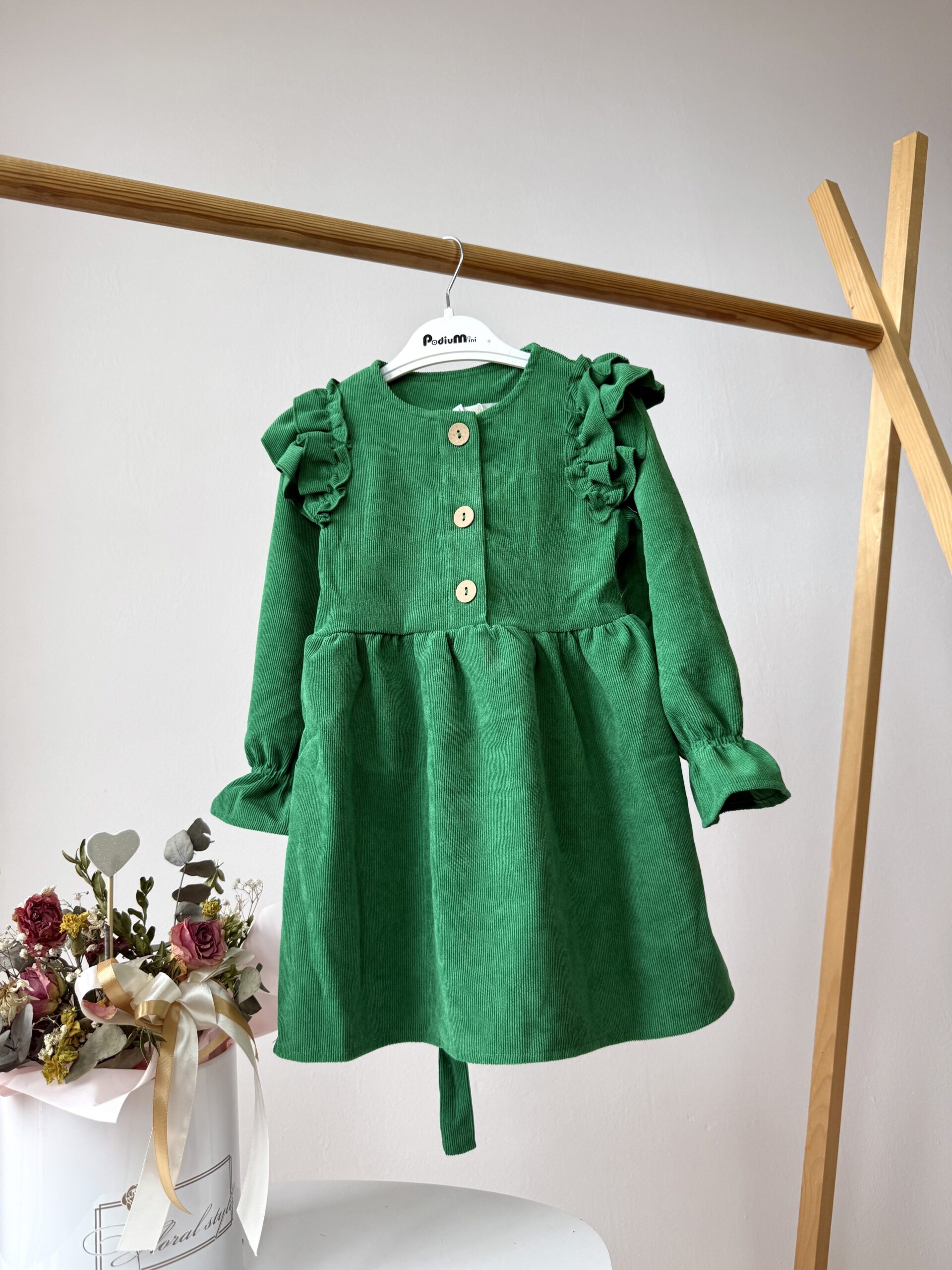Вельвет рубчик відмінної якості. Спереду прикрашено рюшами. Гарно тримає форму.