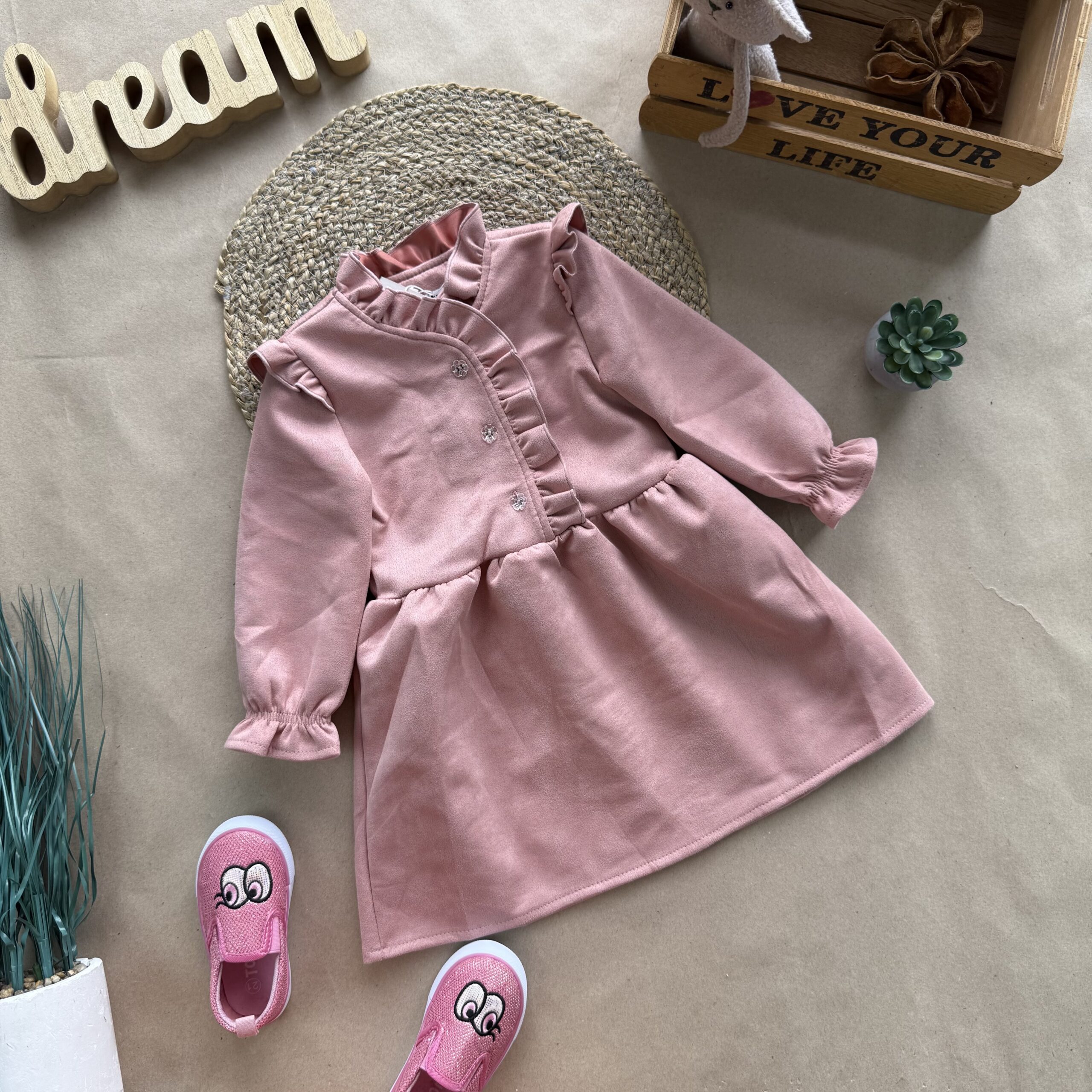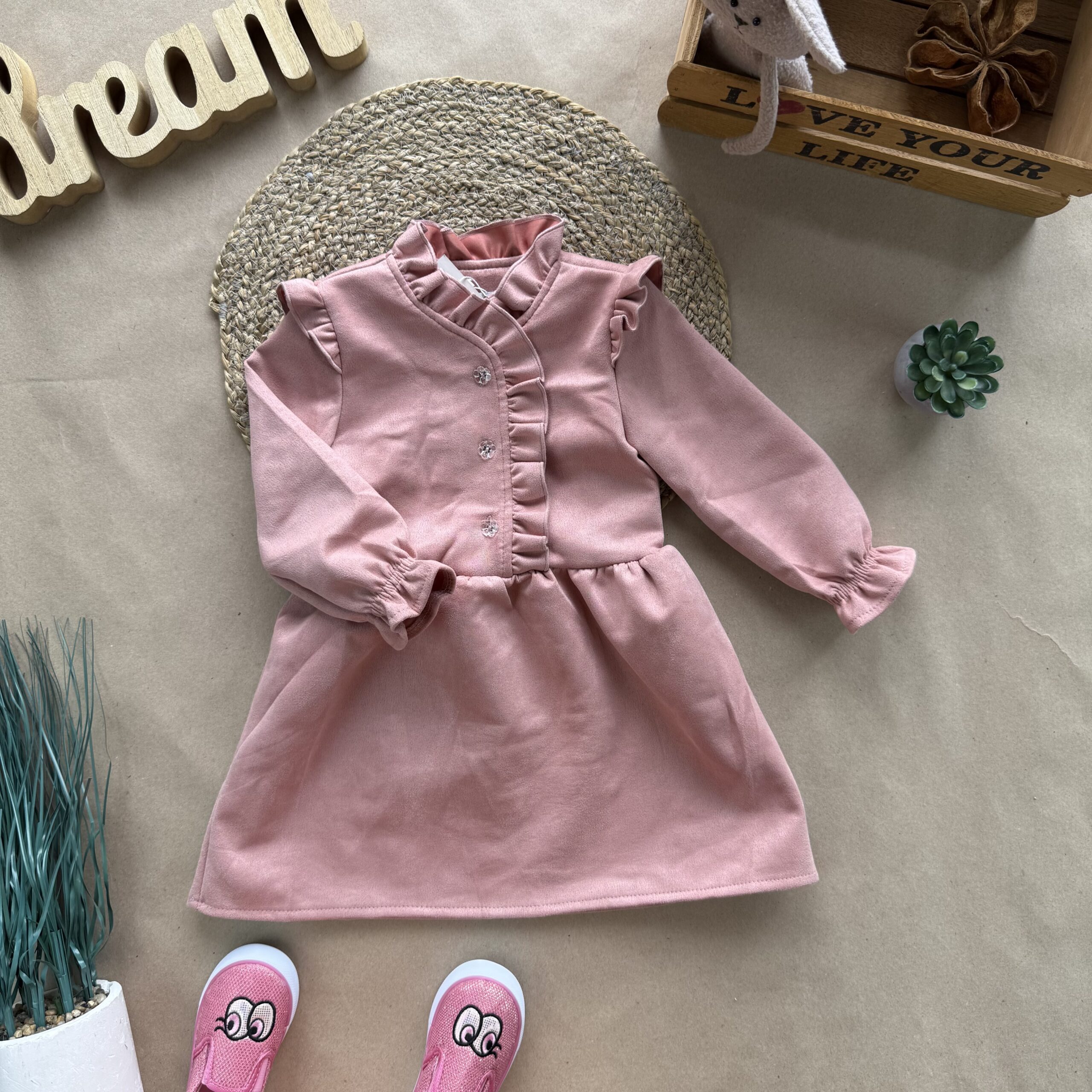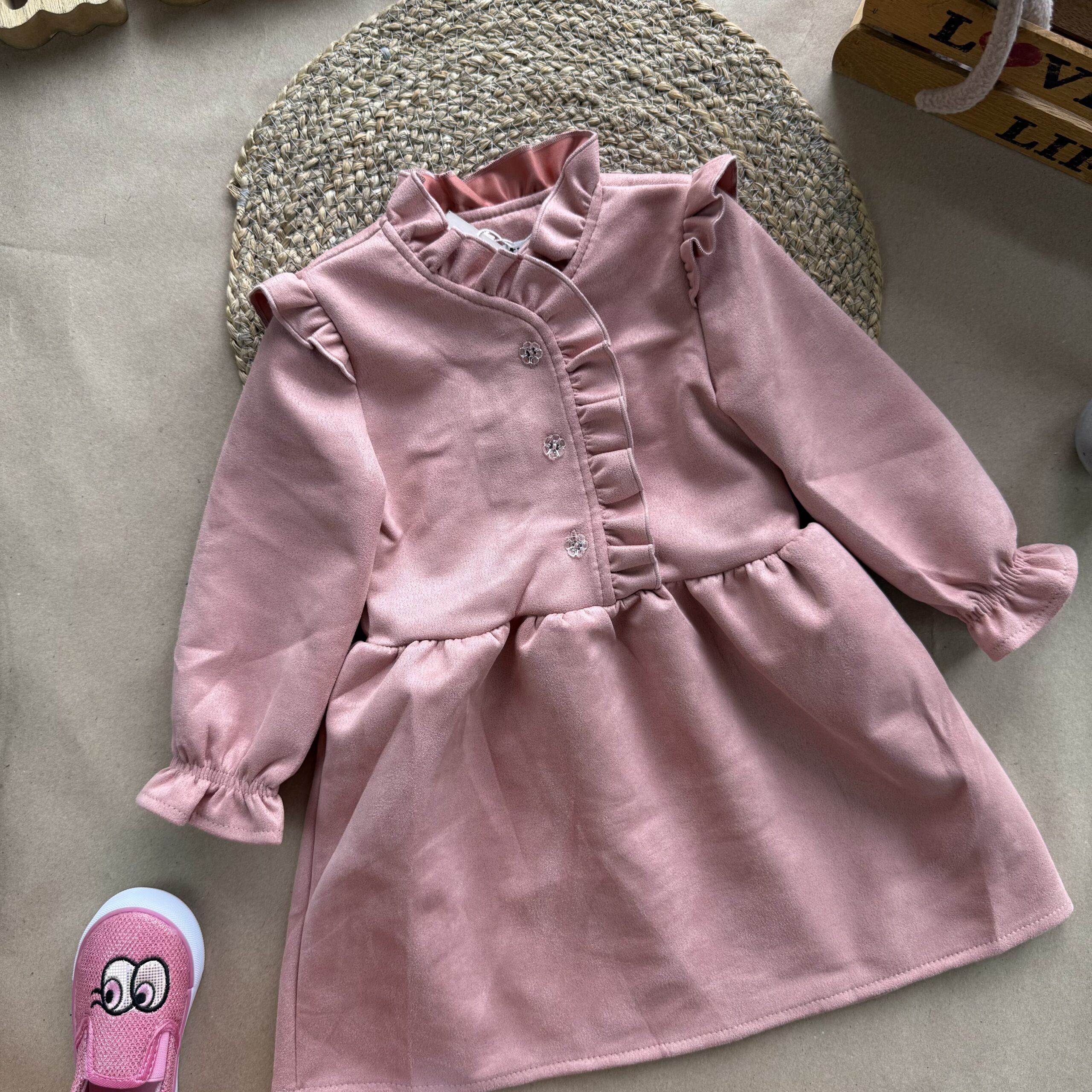 Ніжна дитяча сукня. М’яка оксамитова тканина (замш на трикотажній основі) приємна до тіла. Прикрашена рюшами вздовж застібки на ґудзики, що додає чарівності.  Ідеальний варіант для святкових подій!