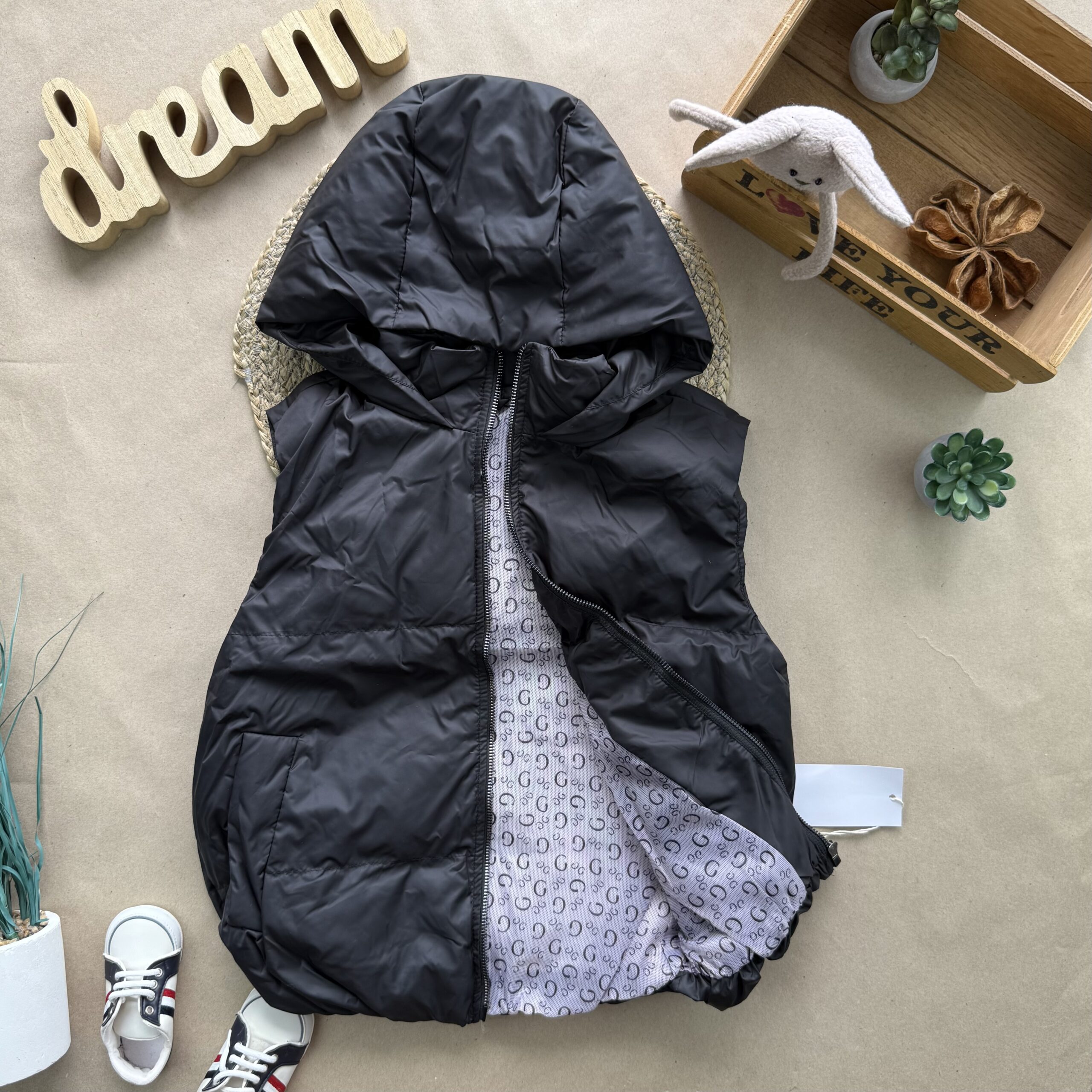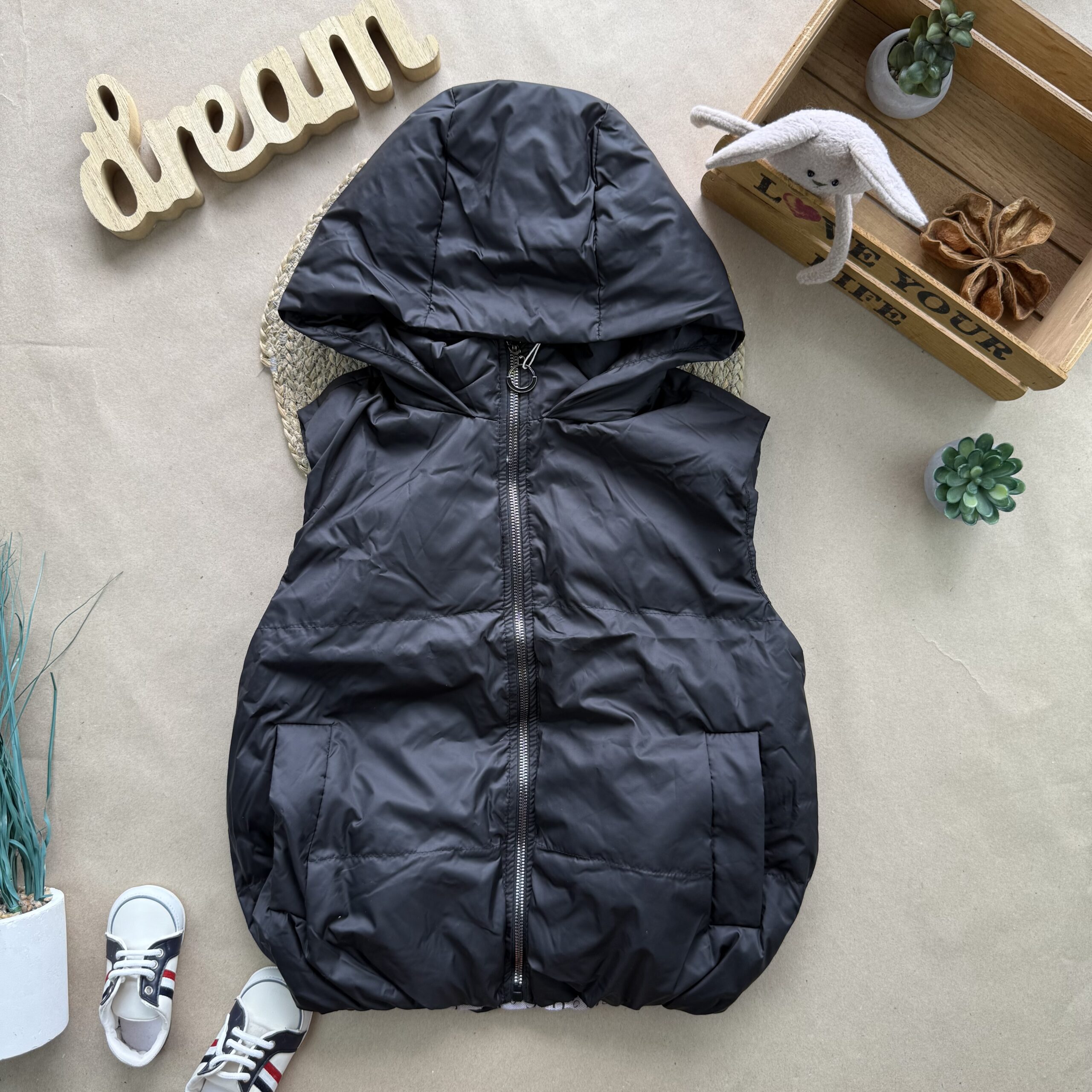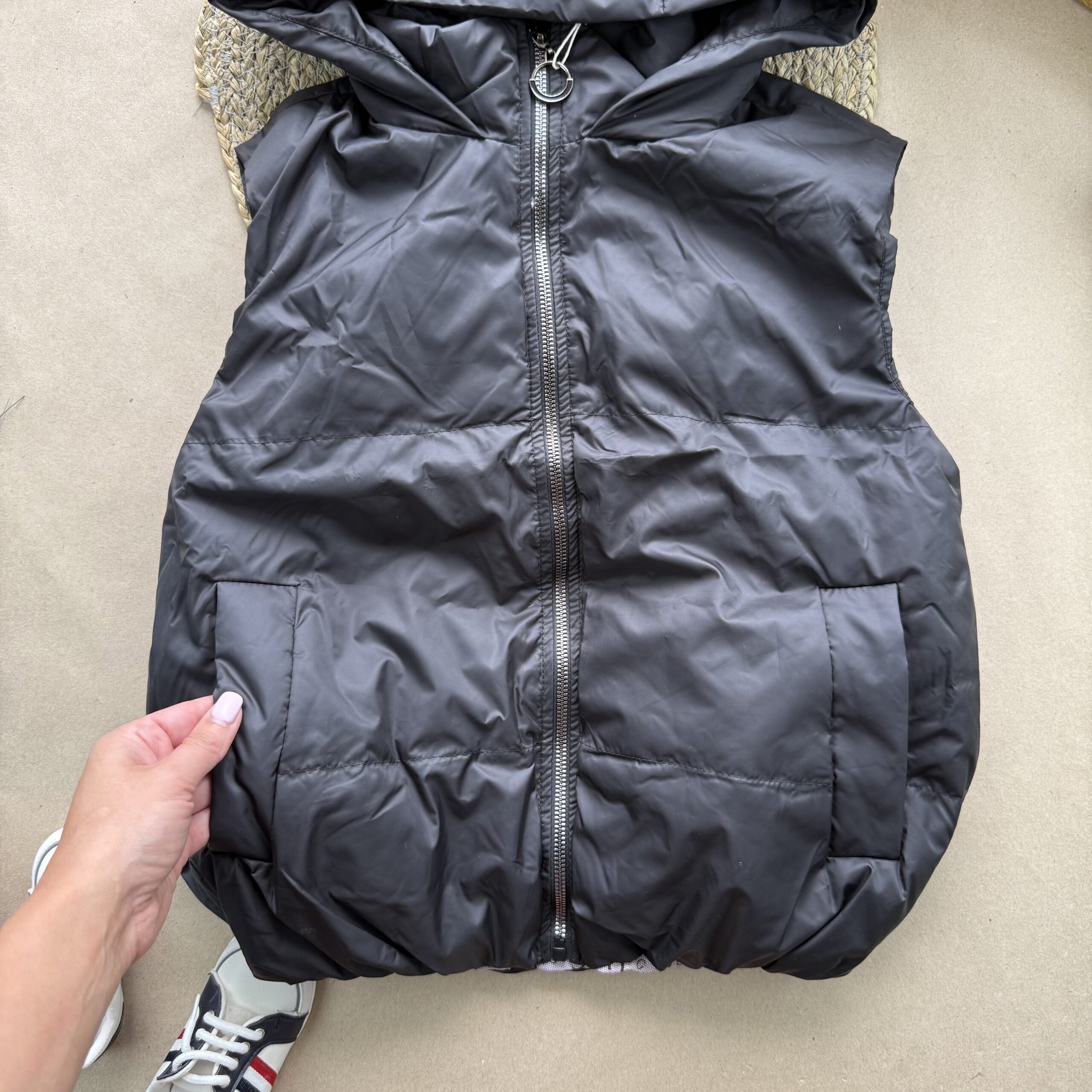 Стильний та зручний жилет. Верх – болонь, наповнювач силікон 150. Застібається на блискавку, дві кишені. Подовжений з капюшоном.